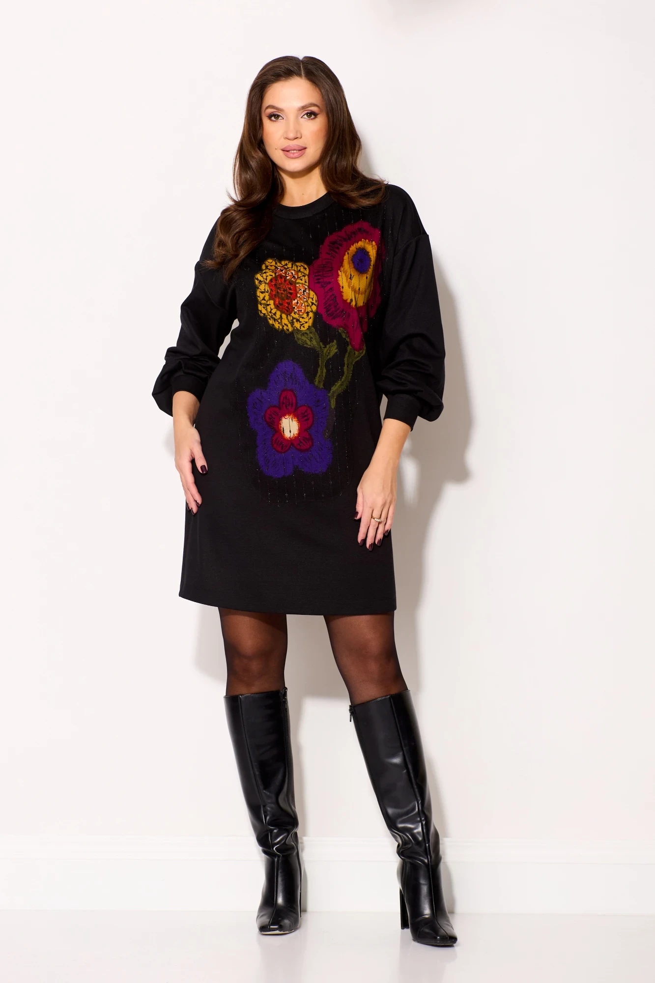 Платье (туника) свободного силуэта из трикотажной ткани с принтом. Рукав втачной одношовный со складками по низу и манжетой. Горловина обработана планкой. По переду поверх принта настрочена сетка Длина платья - 93 см, длина рукава платья - 53 см.