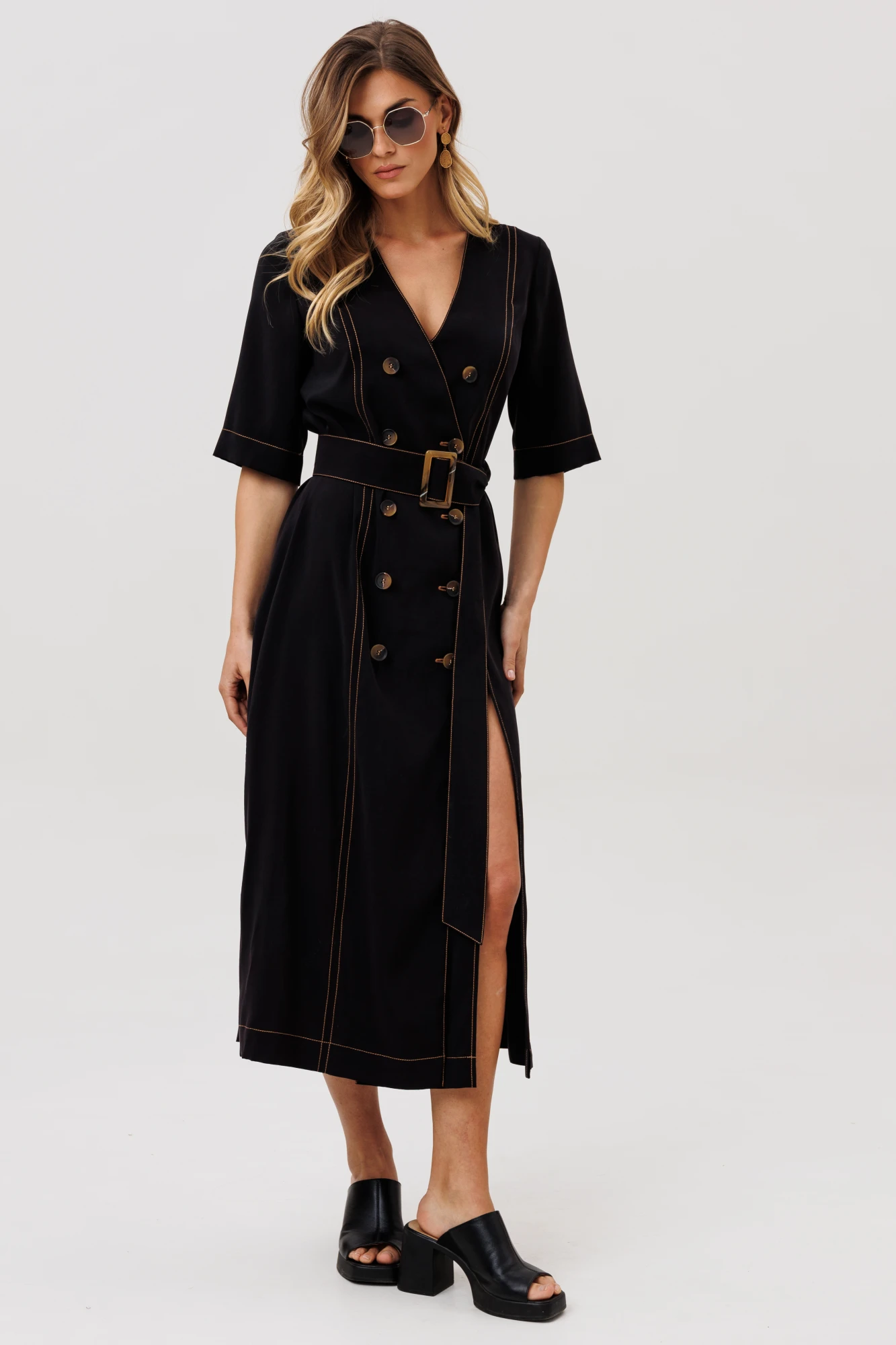 Платье А-образного силуэта с двубортной застежкой из вискозной летней ткани. Перед с рельефами и разрезом. Спинка со средним швом. Рукав втачной одношовный. Рельефы, борта, горловина и низ отстрочены декоративной строчкой. К платью прилагается пояс из основной ткани с пряжкой в цвет пуговиц.