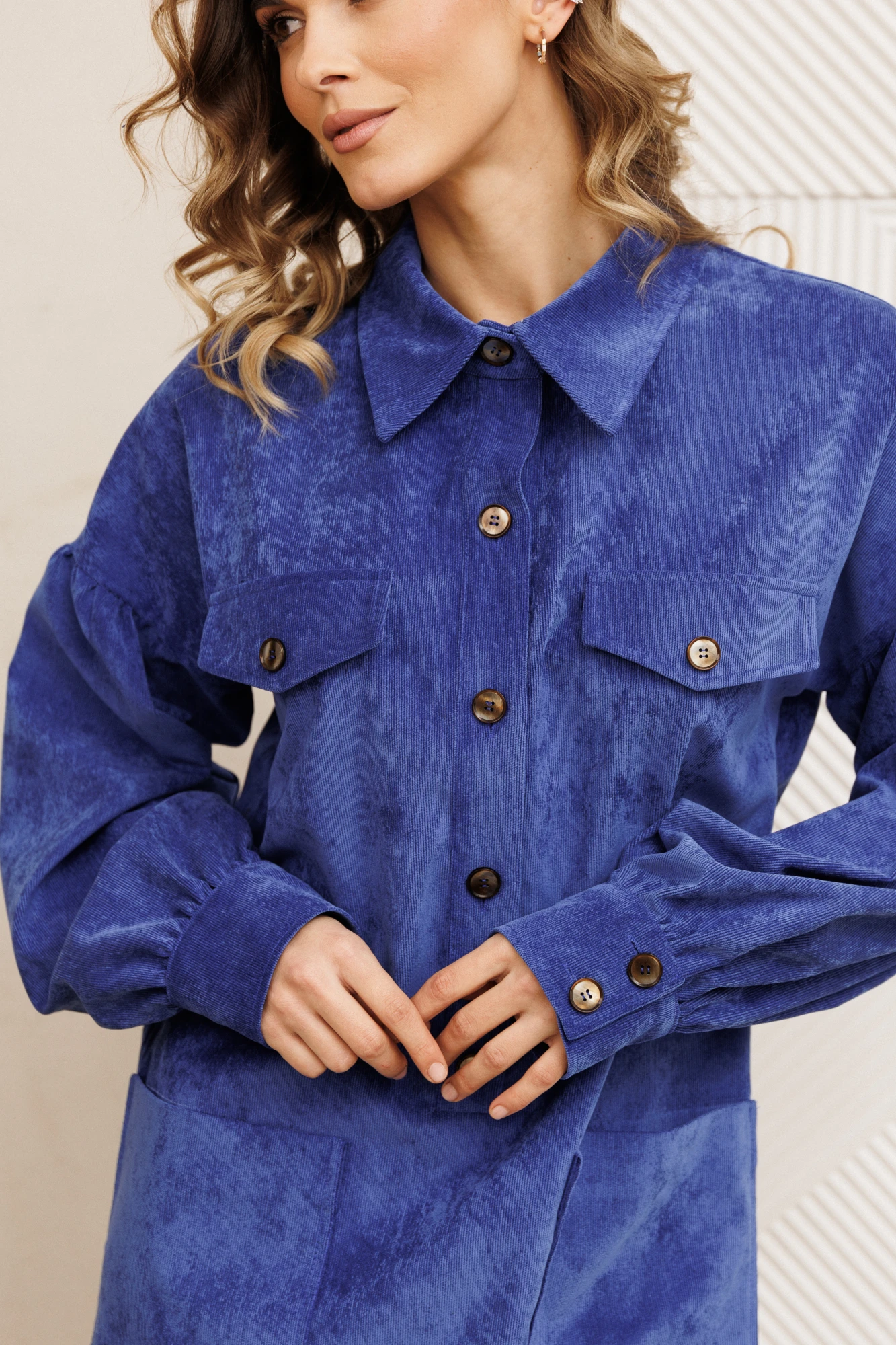 Платье прямого кроя из вельветовой ткани. Перед с застежкой "поло". Воротник на стойке. В районе бедер настрочные карманы, в районе груди настрочные клапаны. Рукав со спущенным плечом, втачной, со сборкой по окату и в месте притачивания манжеты. Манжета с застежкой на 2 петли и пуговицы. Фурнитура может быть изменена с сохранением художественного образа. Длина платья - 92 см, длина рукава платья - 51см.