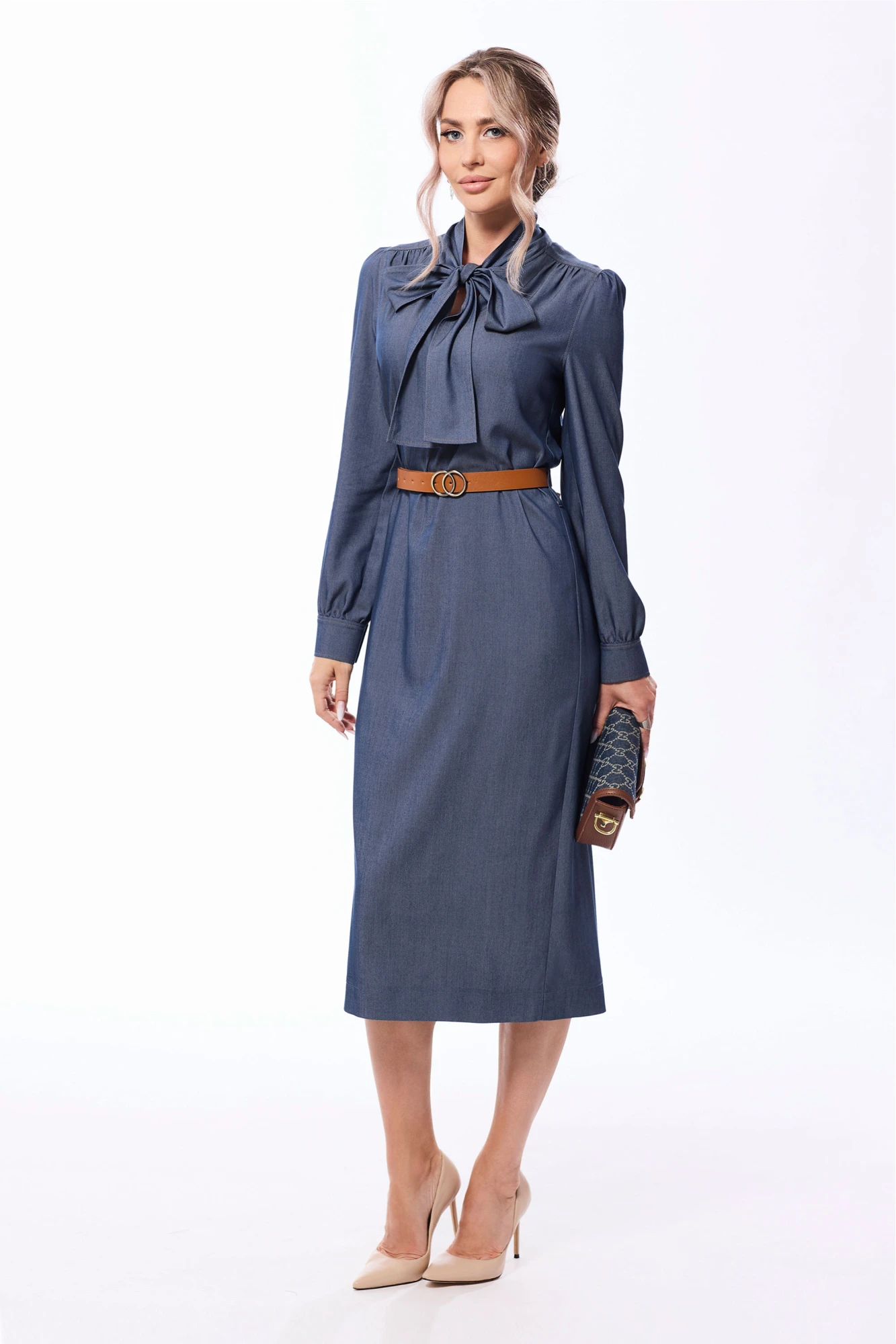 атье с отрезным воротником- стойкой переходящей в бант- завязку, фигурным вырезом по горловине переда. Платье с отрезной кокеткой, переходящей на перед. По шву притачивания кокетки по полочке и спинке- сборка. Рукав втачной, длинный, с отрезной манжетой. Окат рукава и шов притачивания манжеты со сборкой. Платье со съемным поясом. На боковых швах расположены шлевки для пояса.
