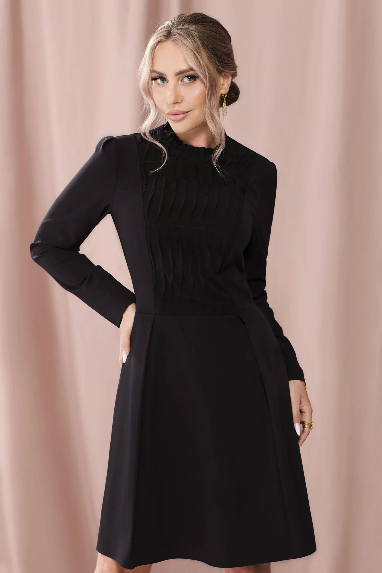 Платье полуприлегающего силуэта, с застежкой на потайную молнию в среднем шве спинки, с отрезным воротником- стойкой, заложенным в односторонние складки. Платье отрезное по линии талии. Верхняя часть переда с рельефами, выходящими из плеча. Центральная часть переда с декоративными защипами .Спинка со средним швом, рельефами, выходящими из плеча. Рукав втачной, длинный. Нижняя часть платья расширенная к низу.