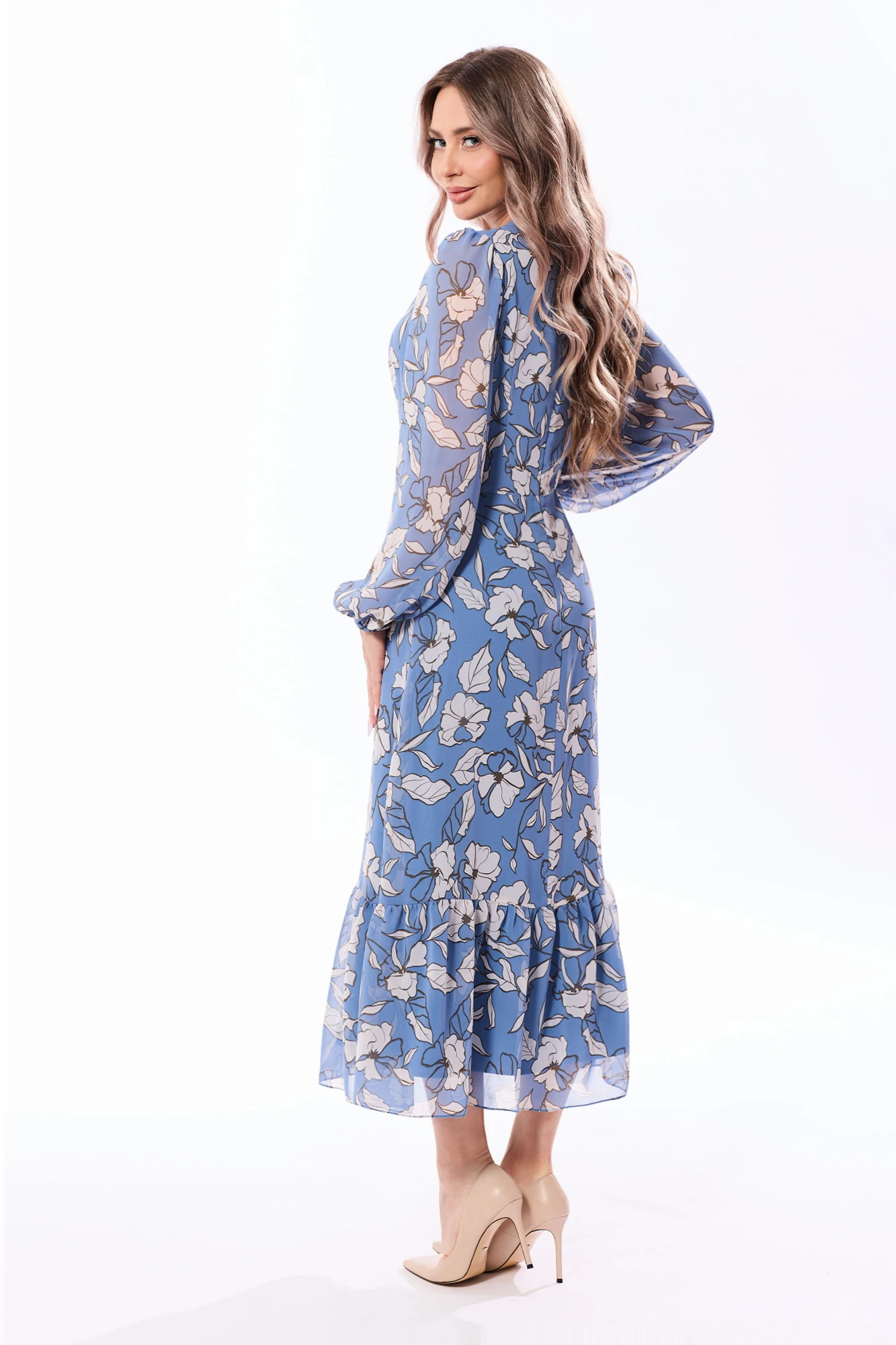 латье без воротника, с круглым вырезом горловины, с застежкой на потайную молнию в среднем шве спинки. Платье отрезное по линии талии. По лифу переда с нагрудными и талиевыми вытачками. Спинка со средним швом, по лифу спинки с талиевыми вытачками. Нижняя часть платья расширенная к низу. По низу платья- волан. Рукав втачной, длинный, с отрезной манжетой. Шов притачивания манжеты и окат рукава присборены.