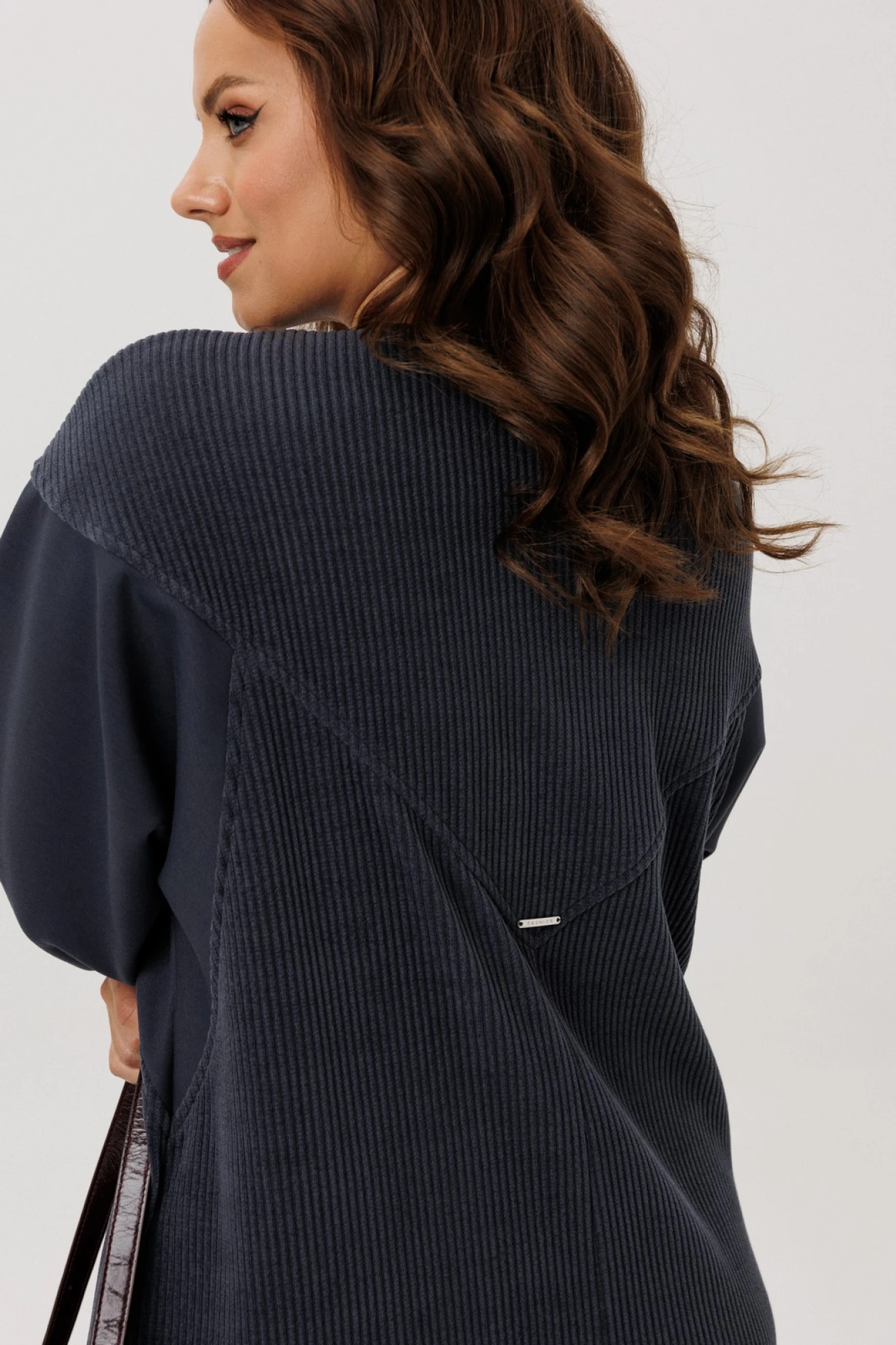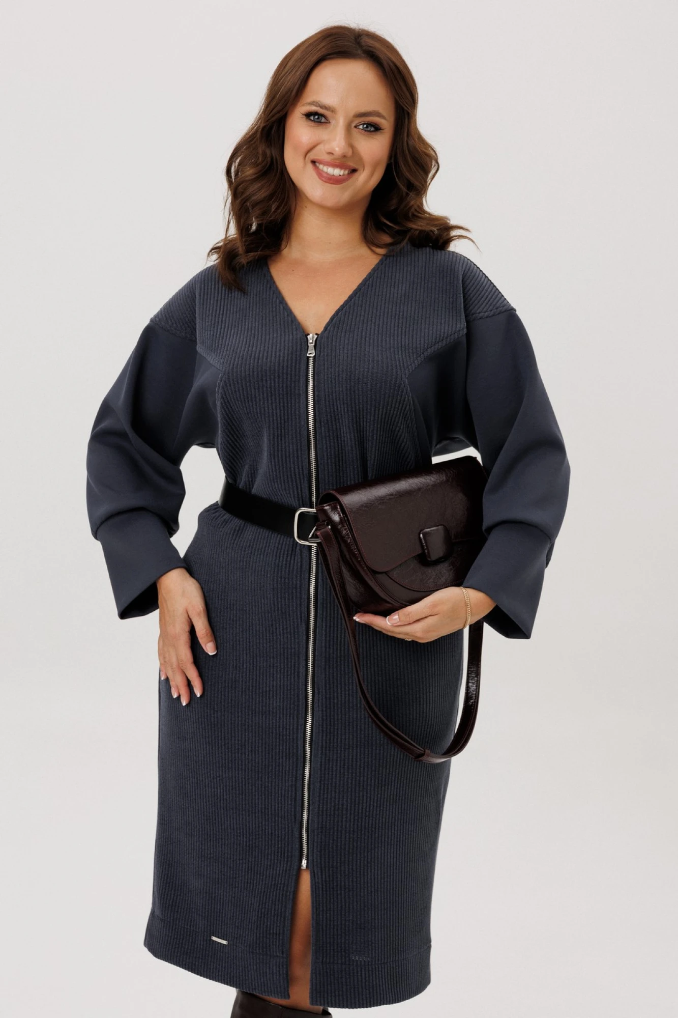 Платье полуприлегающего силуэта, вырез горловины V – образный, рукав цельнокроеный спущенный со вставками из кожи и на манжете внизу. По спинке кокетка, в боковых швах функциональные карманы. Застежка на тесьму-молнию. В комплекте ремень из экокожи.