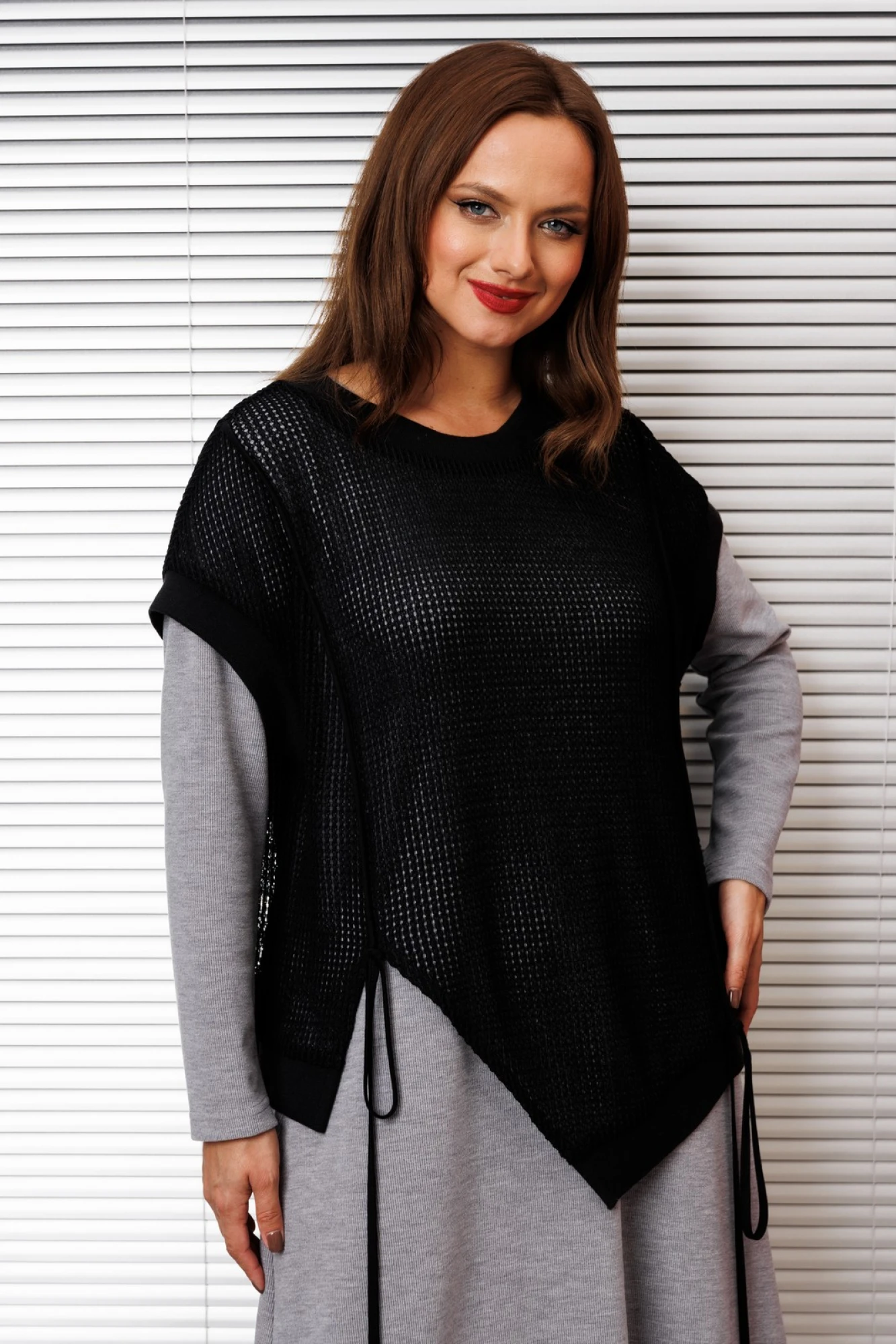 Жилет свободного силуэта из ажурной сетки с асимметричным низом и декоративными завязками по бокам.