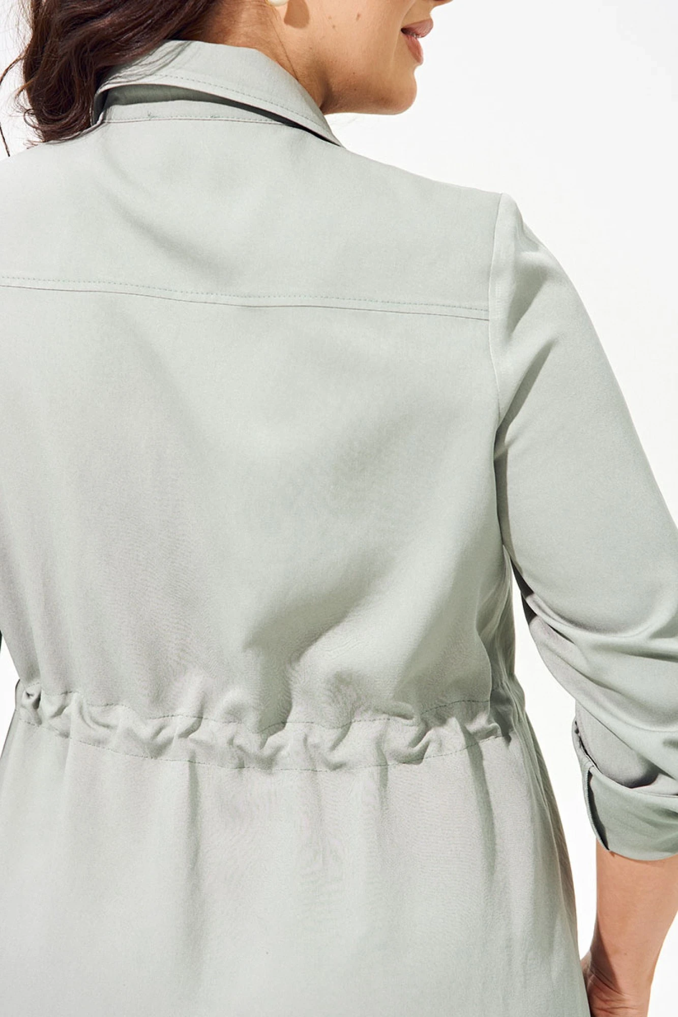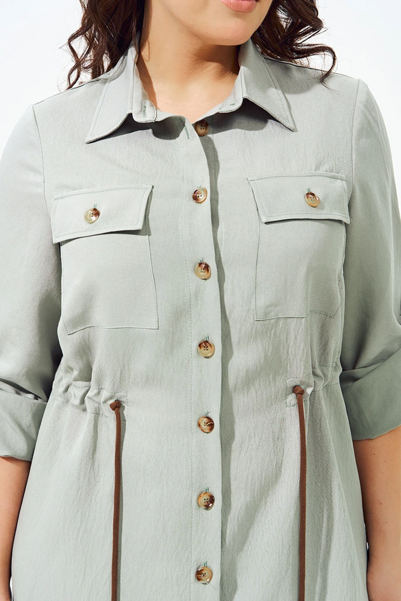 Платье-рубашка полуприлегающего силуэта выполнено из натуральной ткани (вискоза 90%). Платье свободного силуэта со втачными рукавами, внутренней патой и манжетой, что позволяет регулировать высоту рукава и представляет собой стильную деталь с изысканным акцентом; воротник рубашечный; по переду накладные карманы и функциональная кулиса по линии талии с декоративным шнуром-завязкой; застежка на петли и пуговицы. Платье соответсвует заявленному размеру.