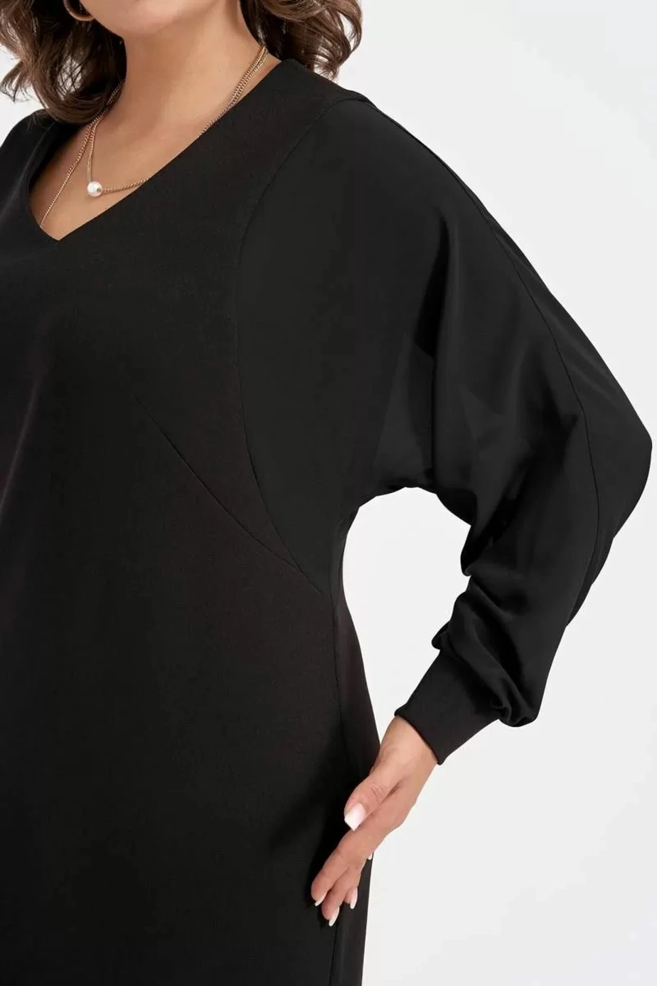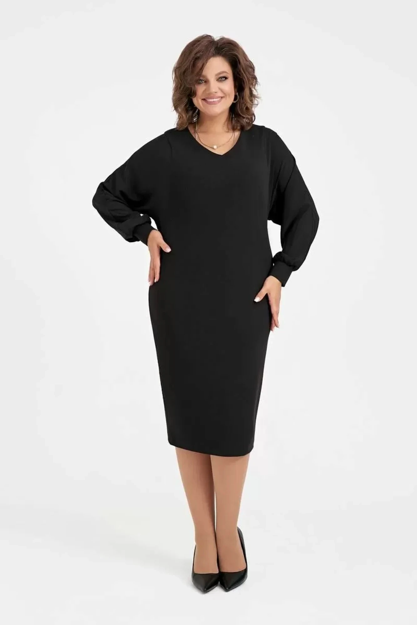 Женское платье полуприлегающего силуэта выполнено из двух видов ткани. Перед и спинка - из плательного трикотажа, рукава - из креп-шифона. Рукава выполнены с углубленной линией проймы и манжетами.