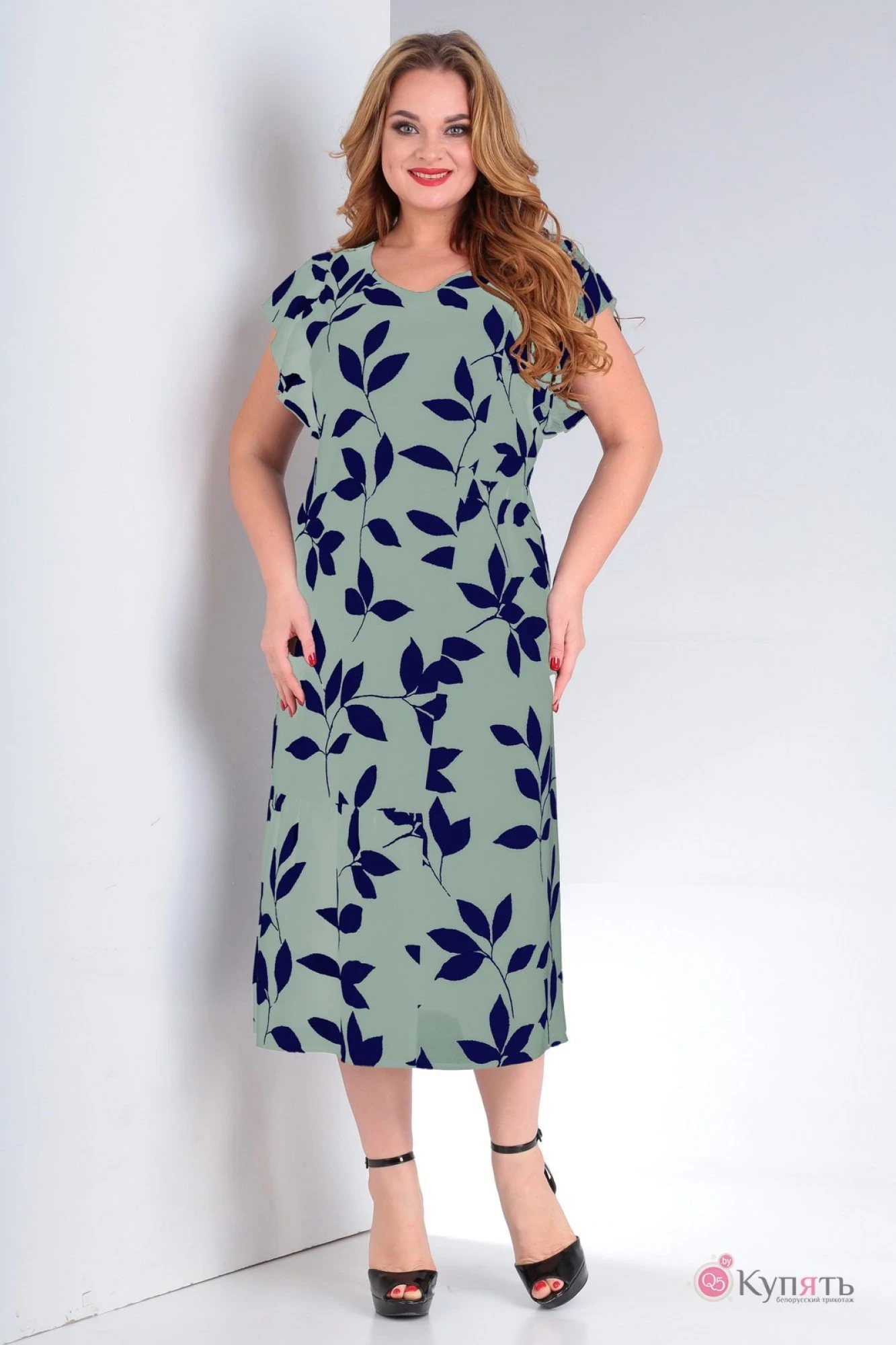 Платье летнее, полуприлегающего силуэта из вискозной ткани. Полочка с ассиметричными конструктивными линиями. В горизонтальных подрезах по талии и низу сборка. Спинка со средним швом, на талии завязывающийся пояс, по низу волан. Рукав – удлиненное крылышко. Горловина округлая, окантована.