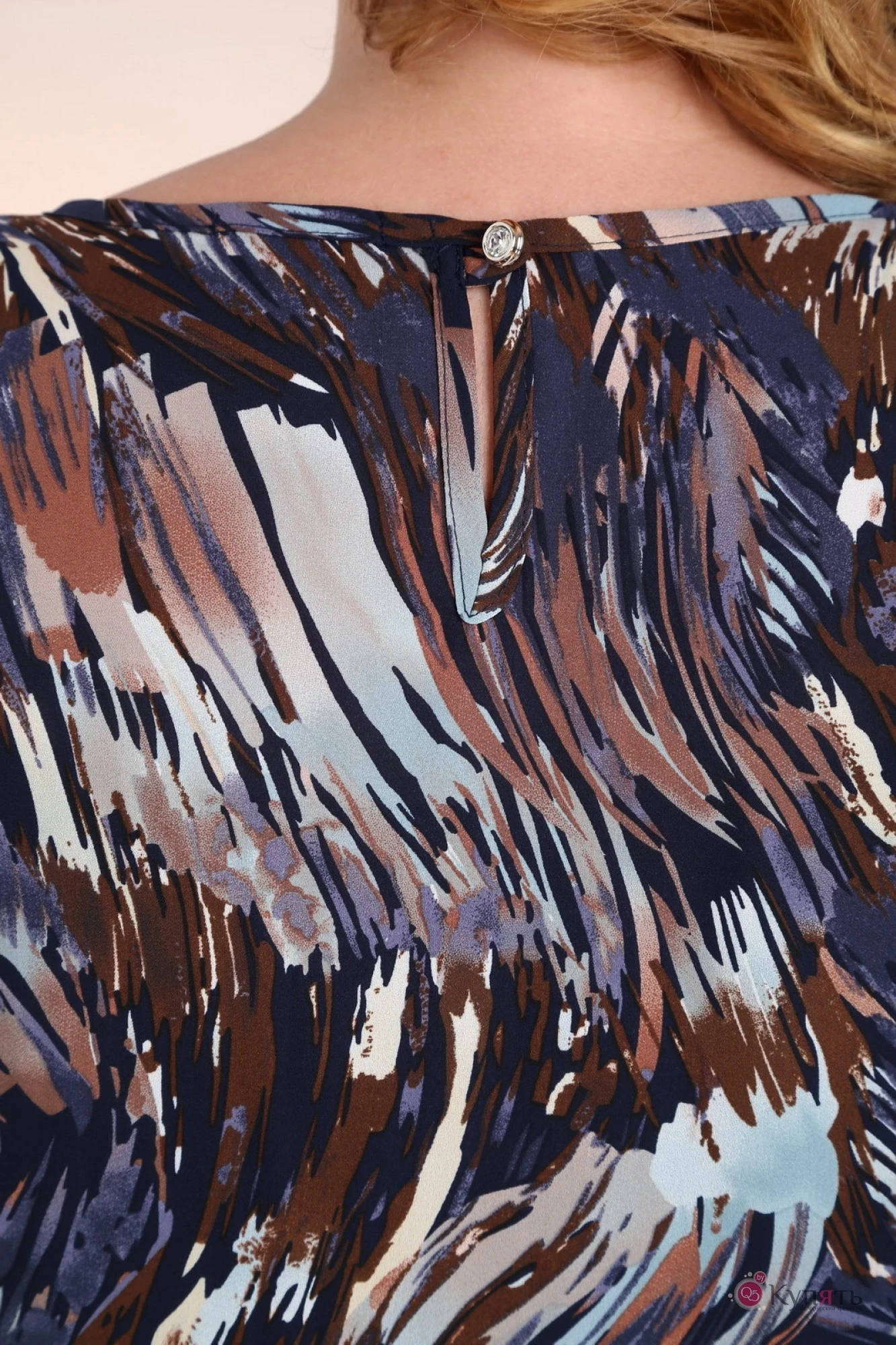 Платье женское, нарядное, А-силуэта, изготовлено из плательной ткани. Горловина круглой формы обработана окантовкой. Рукав втачной длиной 3/4 по низу складки. Перед с ассиметричным подрезом, в котором обработан вырез горловины и разрез. По линии талии имеется кулиса с декоративными завязками. В левой верхней части переда кокетка и застроченные складки. Спинка цельнокроеная.