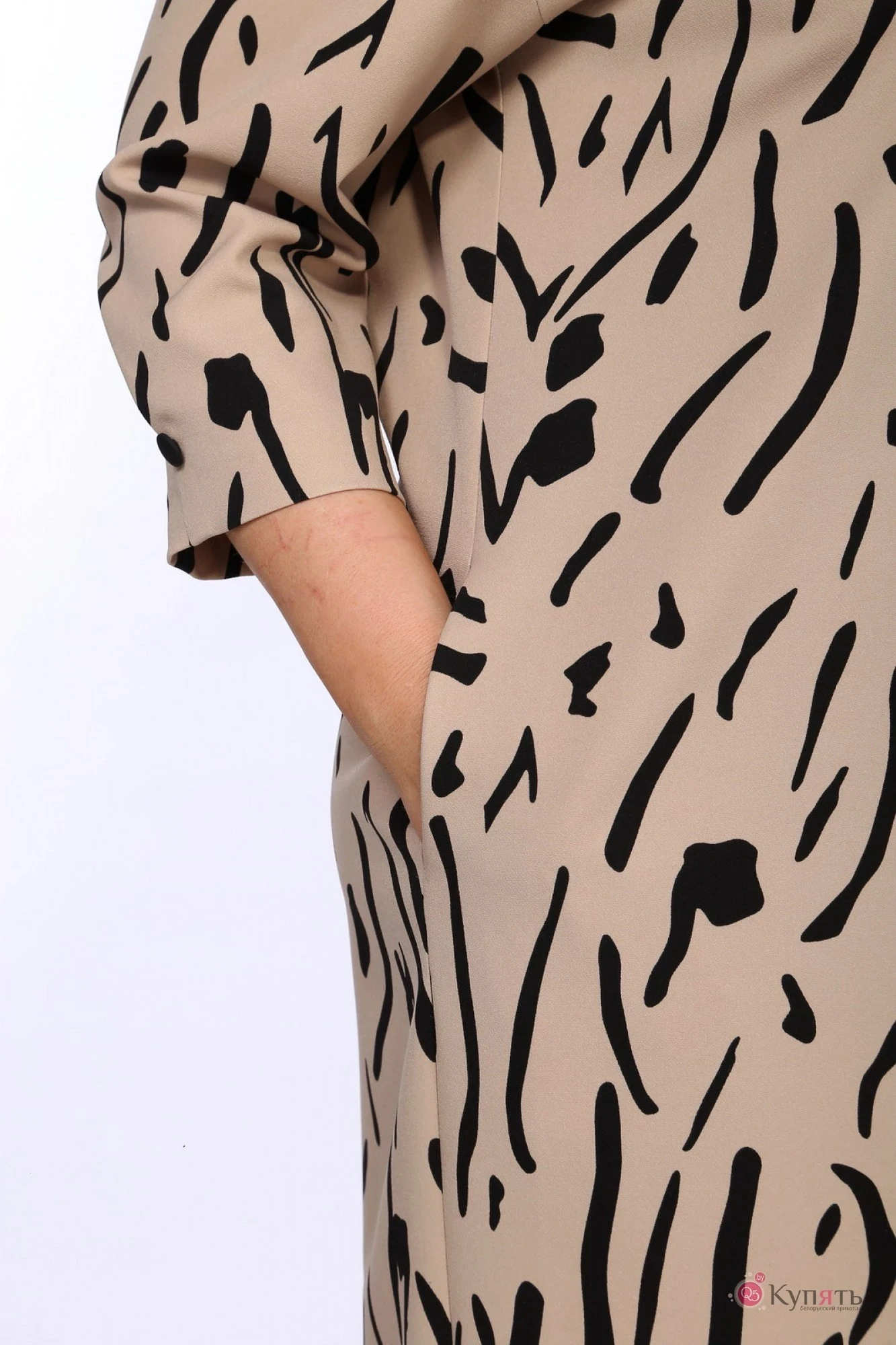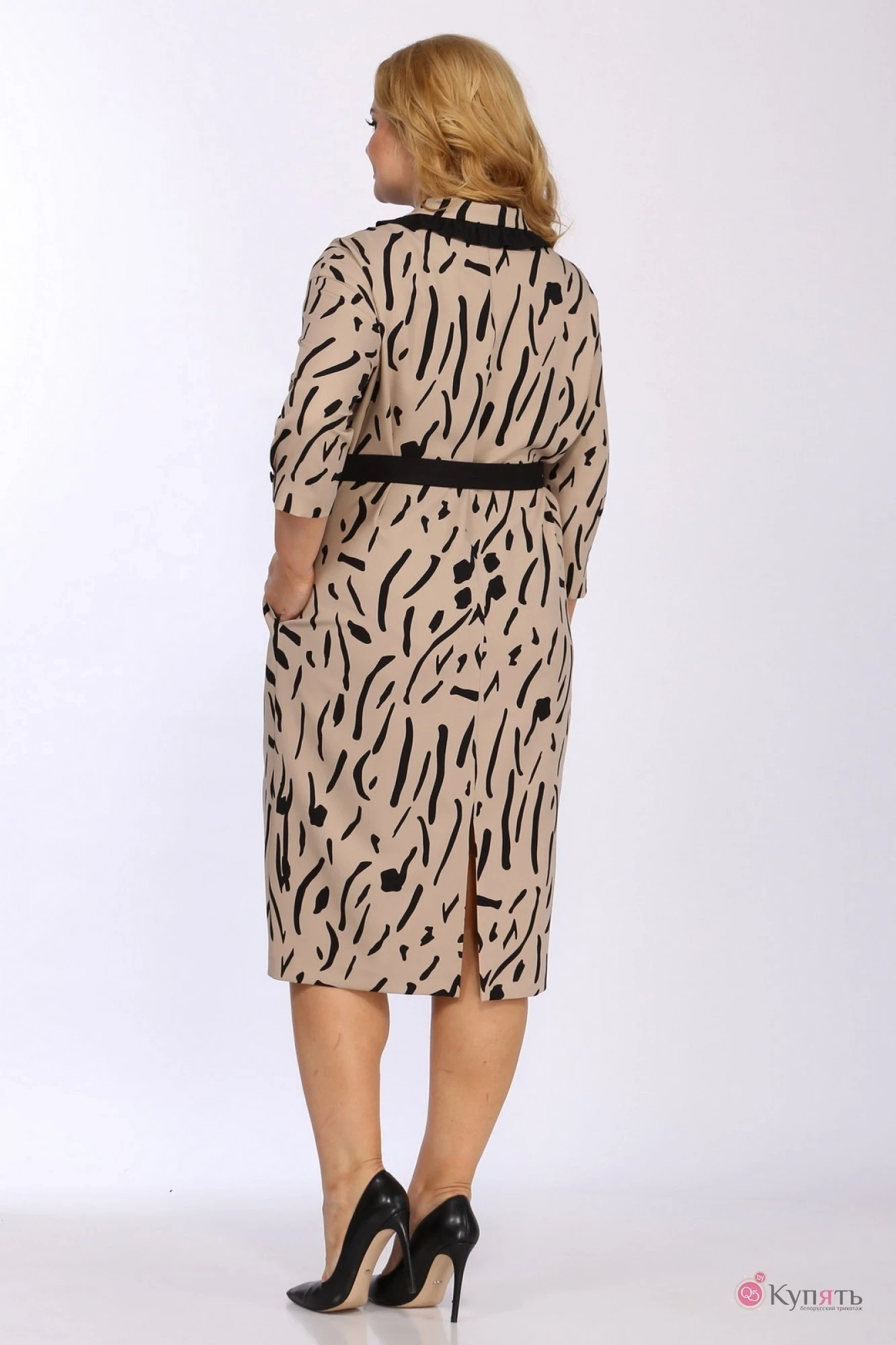 Платье женское прямого силуэта из плательной ткани. Спинка со средним швом и разрезом по низу. Горловина с отложным воротником и планкой, декорированые рюшей. Рукав спущенный со складной по низу. Изделие дополнено съемным поясом. В боковых швах имеются карманы.