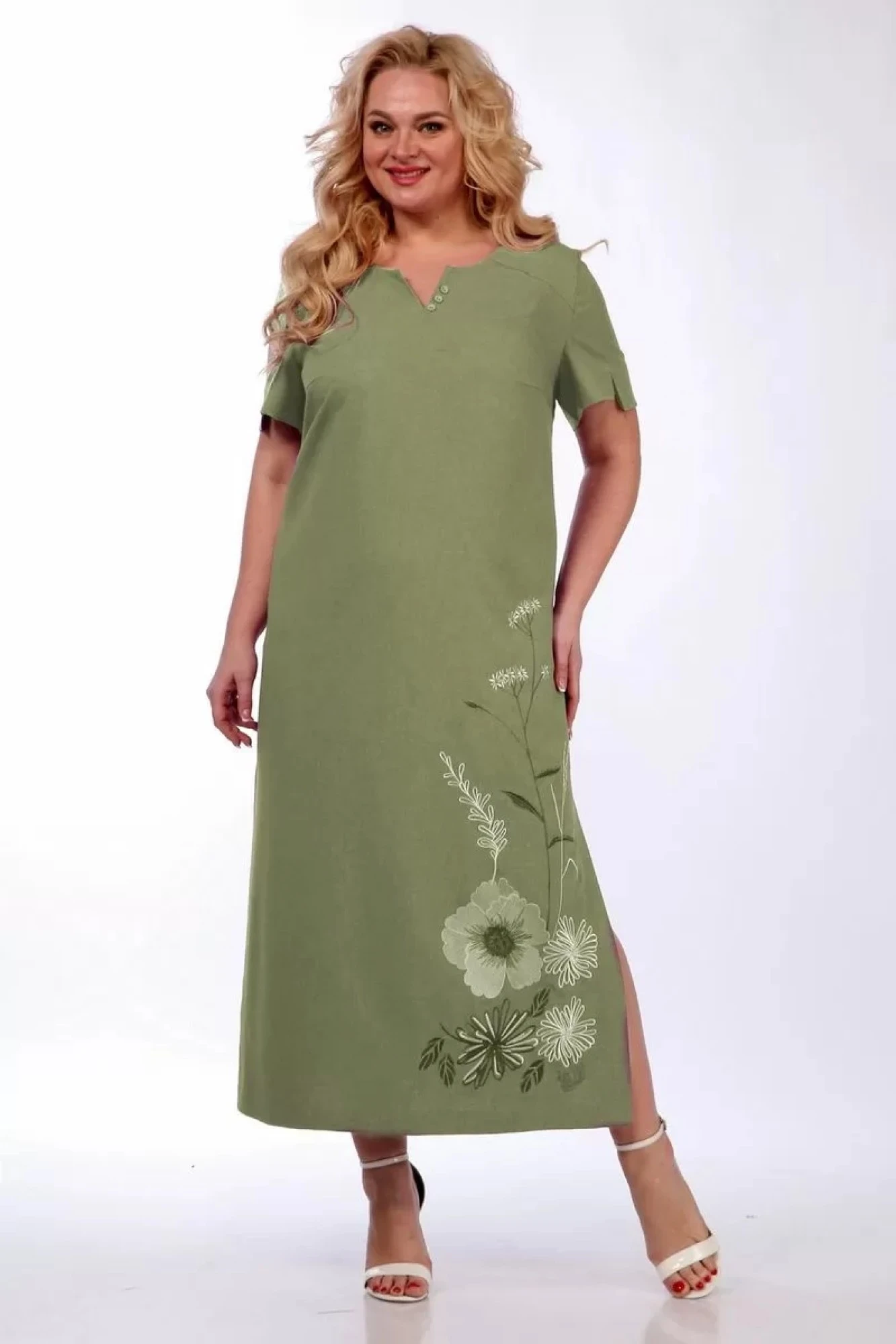 Платье женское прямого силуэта. Горловина фигурной формы. Рукав втачной, разрезной, короткий. По переду нагрудные вытачки и кокетки. Спинка со средним швом. В боковых швах обработаны карманы и разрезы. Платье декорировано дизайнерской вышивкой.