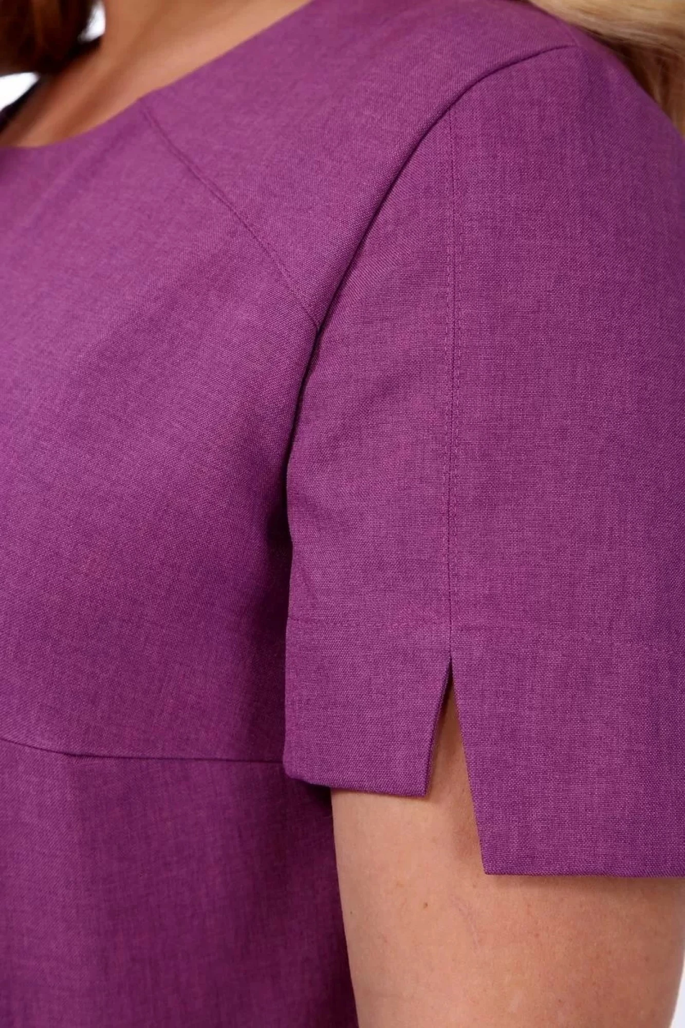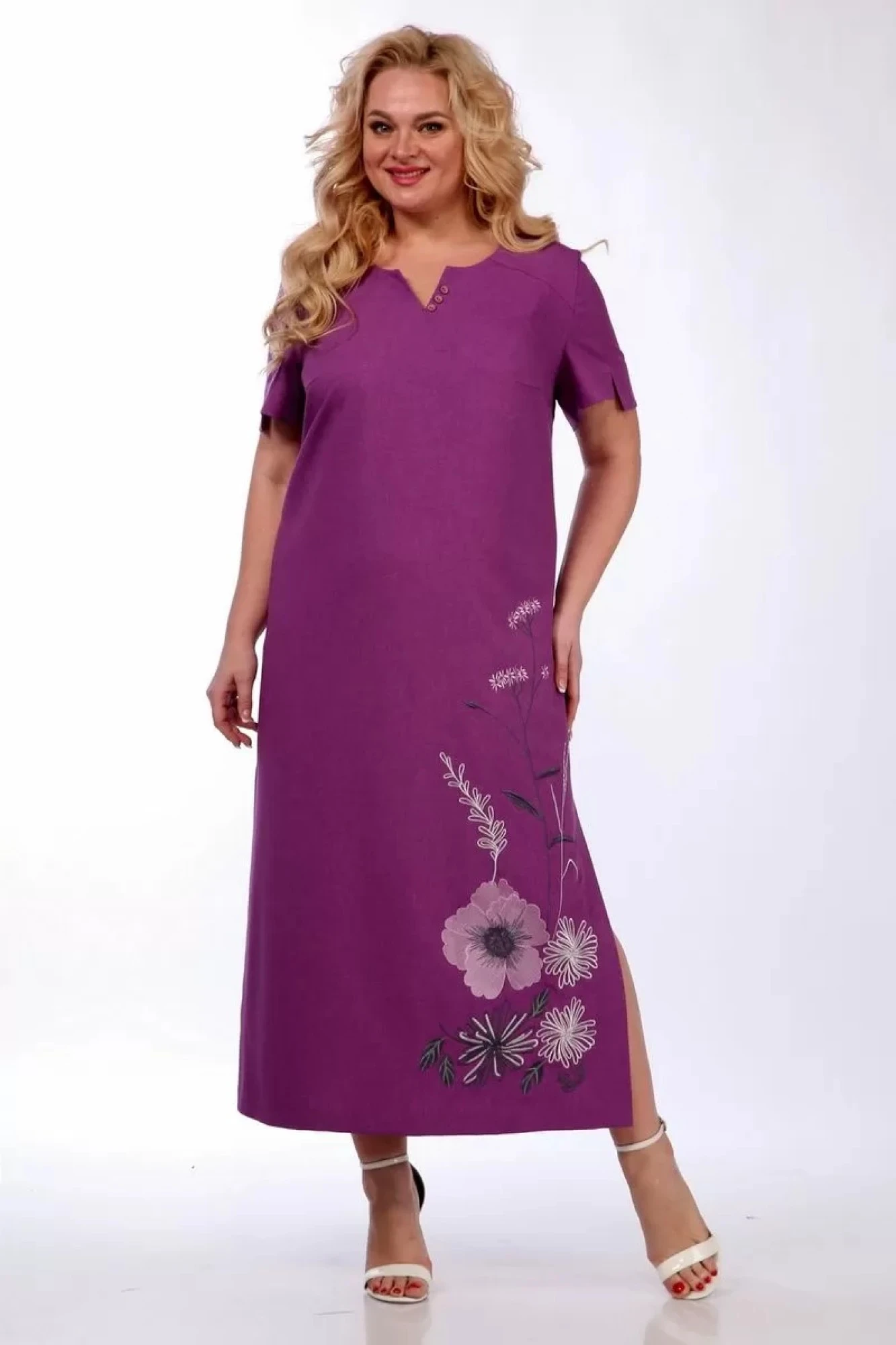 Платье женское прямого силуэта. Горловина фигурной формы. Рукав втачной, разрезной, короткий. По переду нагрудные вытачки и кокетки. Спинка со средним швом. В боковых швах обработаны карманы и разрезы. Платье декорировано дизайнерской вышивкой.