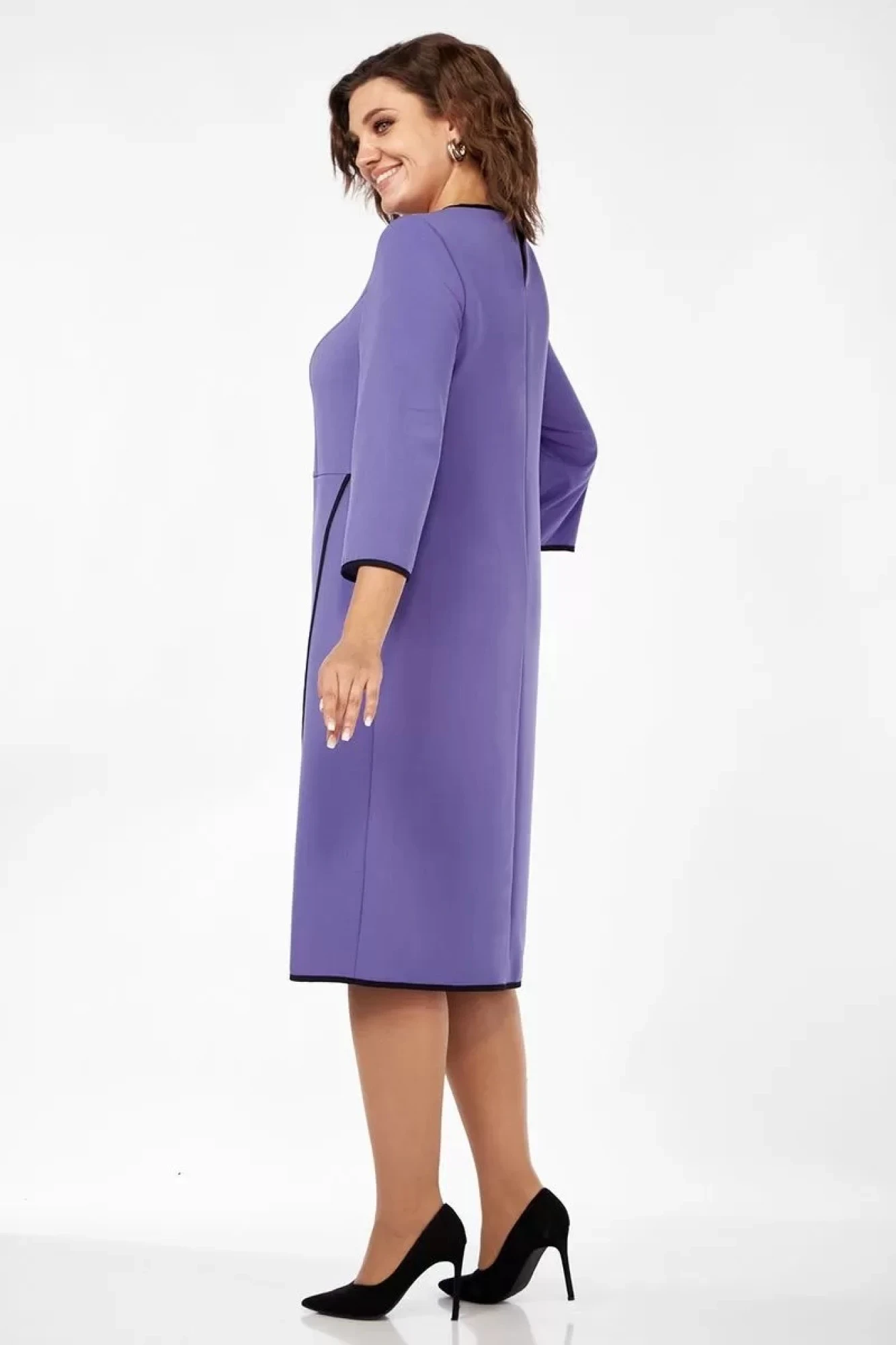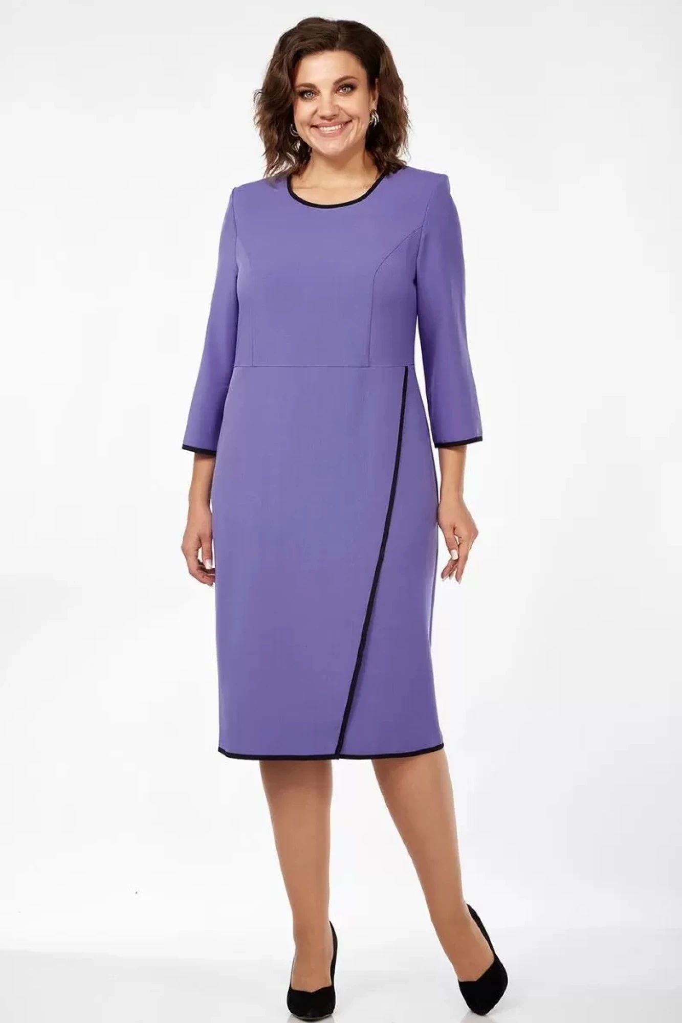 Платье женское прямого силуэта из плательной ткани. Горловина круглой формы. По переду рельефы, отрезное по талии, по юбке элемент запаха. По спинке средний шов, по горловине разрез с застежкой на потайную петлю и пуговицу. Отделка в виде окантовки горловины, низа рукавов, отлетных деталей юбки. В съемный пояс с зажимами на концах.
