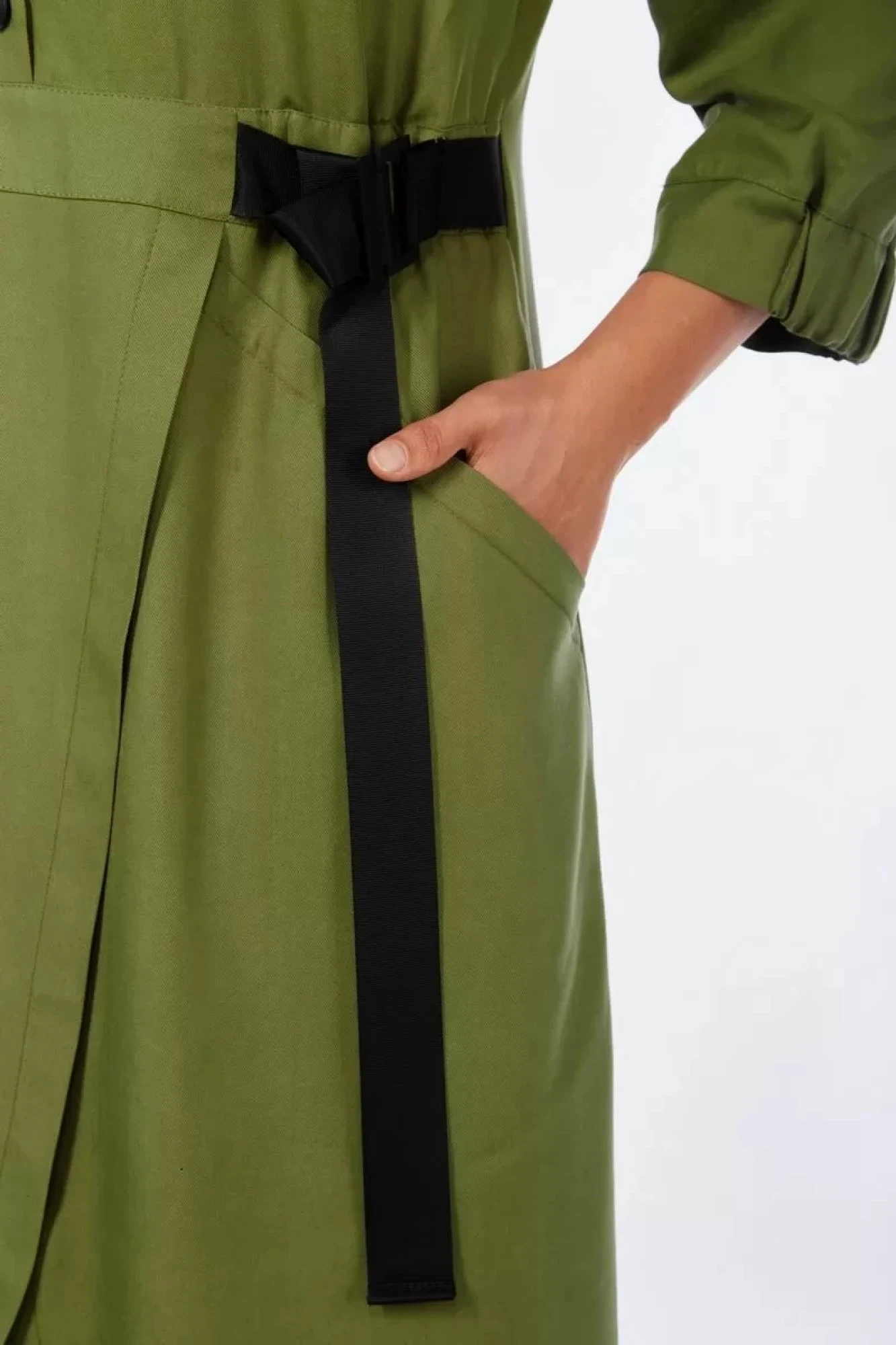 Платье женское А-силуэта из плательной ткани.По переду платья застежка на петли и пуговицы.Отрезное по линии талии с декоративным поясом, присборенный по бокам и отделочной тесьмой с пряжкой. По юбке платья имитация запаха и карман в подрезе. По спинке встречная складка. Рукава втачные, по низу манжеты частично собраны на резинку. В качестве декора — печать на полочке.