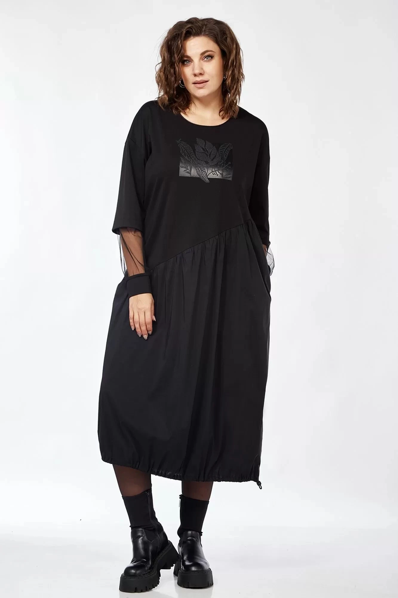 Платье женское свободного кроя, комбинированное трикотажное полотно и хлопок. Платье с косой линией подреза со сборкой. Горловина круглой формы с кантом. На полочке печать. В боковом шве обработан карман. Рукава спущенные, двойные, нижний рукав выполнен из сетки на манжете внизу. По низу платье кулиса, в которую втянут шнур резинка с фиксатором, для регулирования объема внизу. Платье на подкладке от линии подреза.