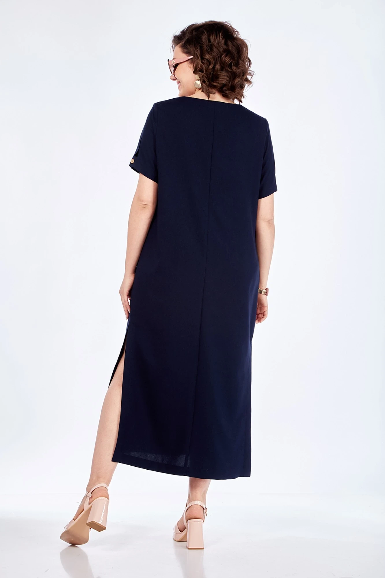 Платье женское прямого силуэта из плательной ткани. Горловина круглой формы. По переду нагрудные вытачки. На спинке средний шов. В боковых швах обработаны карманы, внизу разрезы. Рукава втачные, разрезные с фигурным вырезом. Платье декорировано дизайнерской вышивкой.