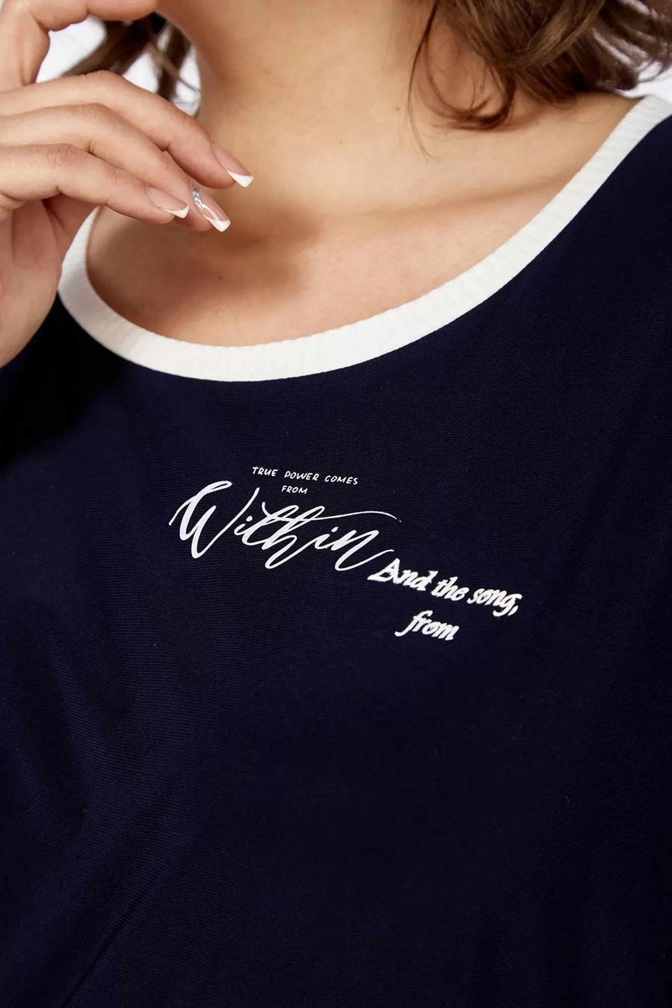 Платье женское А-силуэта комбинированное: лиф из трикотажного полотна, низ из плательной ткани. Горловина круглой формы. На полочке нанесена термоаппликация. По спинке средний шов. Рукав спущенный. Горловина и низ рукавов оформлен мягким довязом. Платье отрезное по талии с кулисой и втянутым декоративным шнуром. Юбка платья разрезная по центру с асимметричными подрезами со сборкой.