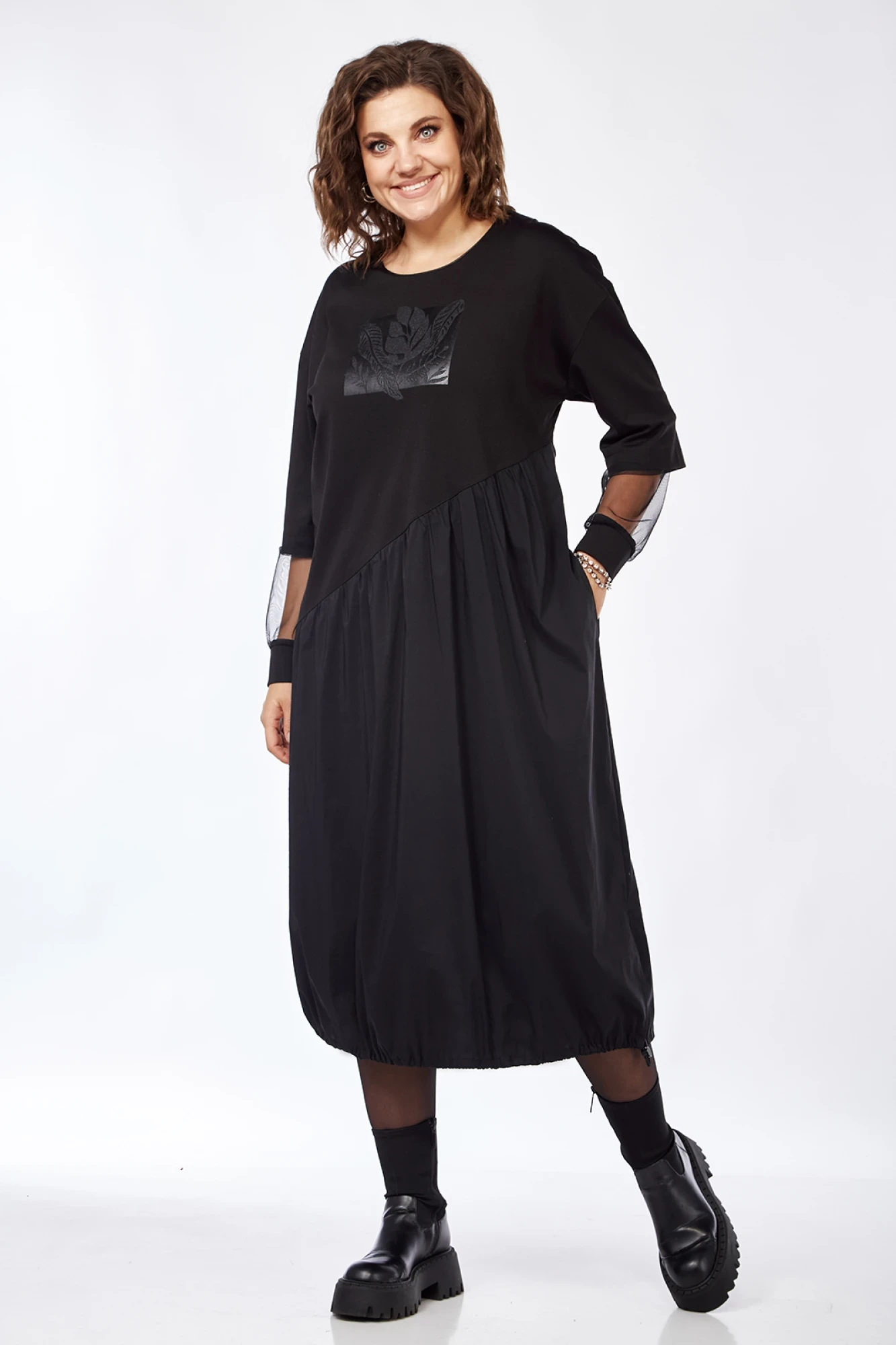 Платье женское свободного силуэта. Выполнено путём комбинирования тканей нескольких видов. Перед и спинка с ассиметричным подрезом. Верхняя часть платья из трикотажного полотна, а нижняя из х/б плащевой ткани. Горловина обработана кантом. Нижняя часть платья со сборкой. В левом боковом шве имеется карман. Рукава спущенные, комбинированные. Верхняя часть из трикотажного полотна, а нижняя часть из трикотажной сетки, на манжете. По низу платье собрано на шнур, втянутый в кулису. Изделие дополнено дизайнерской печатью.