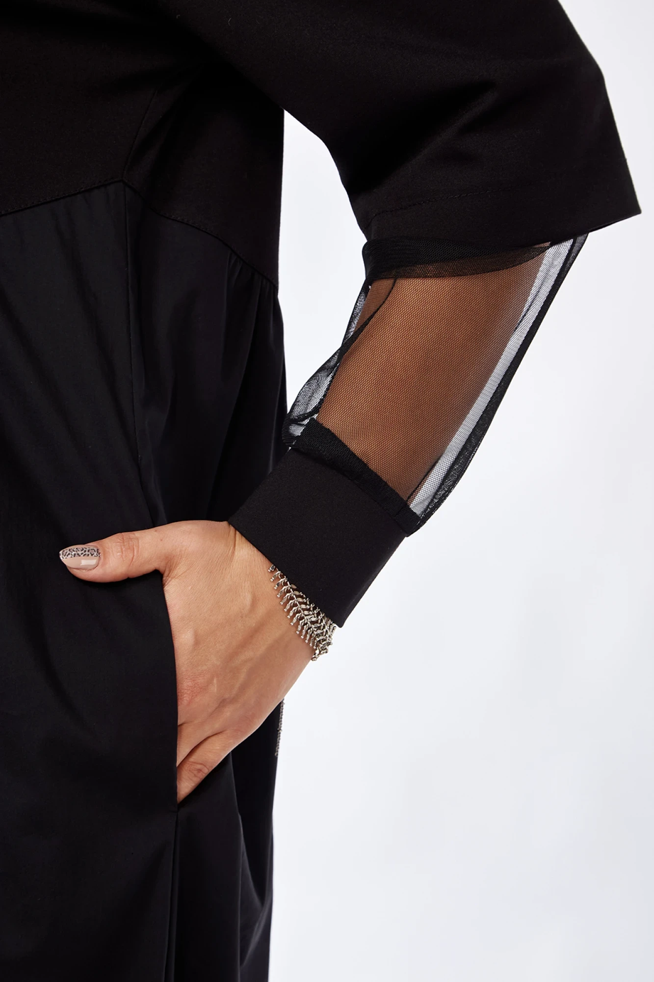 Платье женское свободного силуэта. Выполнено путём комбинирования тканей нескольких видов. Перед и спинка с ассиметричным подрезом. Верхняя часть платья из трикотажного полотна, а нижняя из х/б плащевой ткани. Горловина обработана кантом. Нижняя часть платья со сборкой. В левом боковом шве имеется карман. Рукава спущенные, комбинированные. Верхняя часть из трикотажного полотна, а нижняя часть из трикотажной сетки, на манжете. По низу платье собрано на шнур, втянутый в кулису. Изделие дополнено дизайнерской печатью.