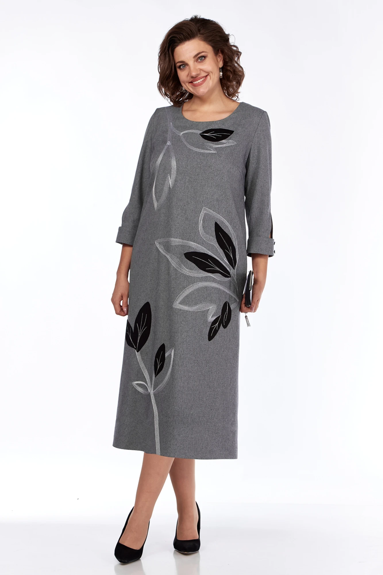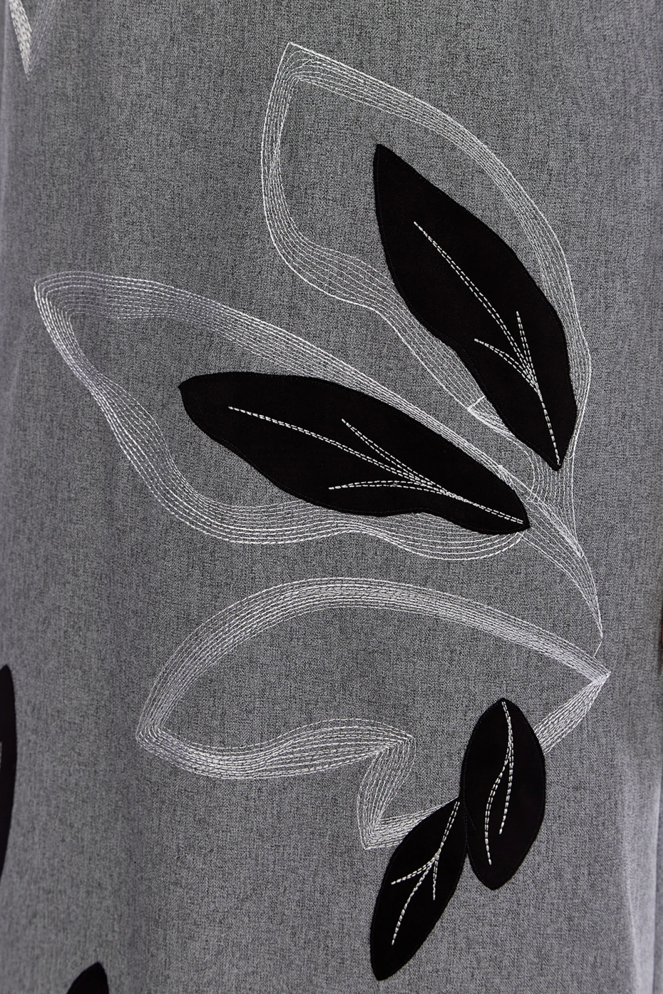 Платье женское , А -силуэта изготовлено из плательной ткани. Горловина округлой формы обработана обтачкой. Перед цельный, дополнен дизайнерской вышивкой — аппликацией. В боковых швах обработаны карманы. Спинка со средним швом. Рукава втачные с фигурным вырезом, на манжете.
