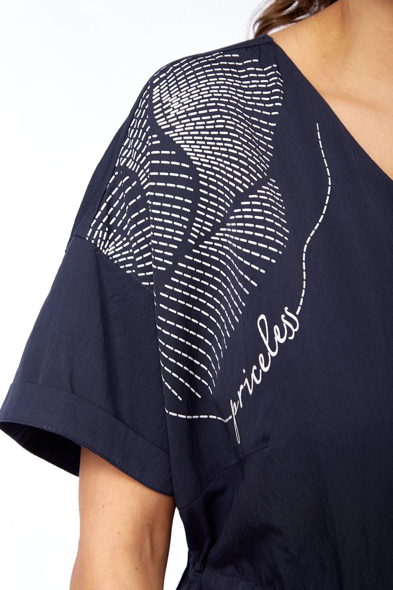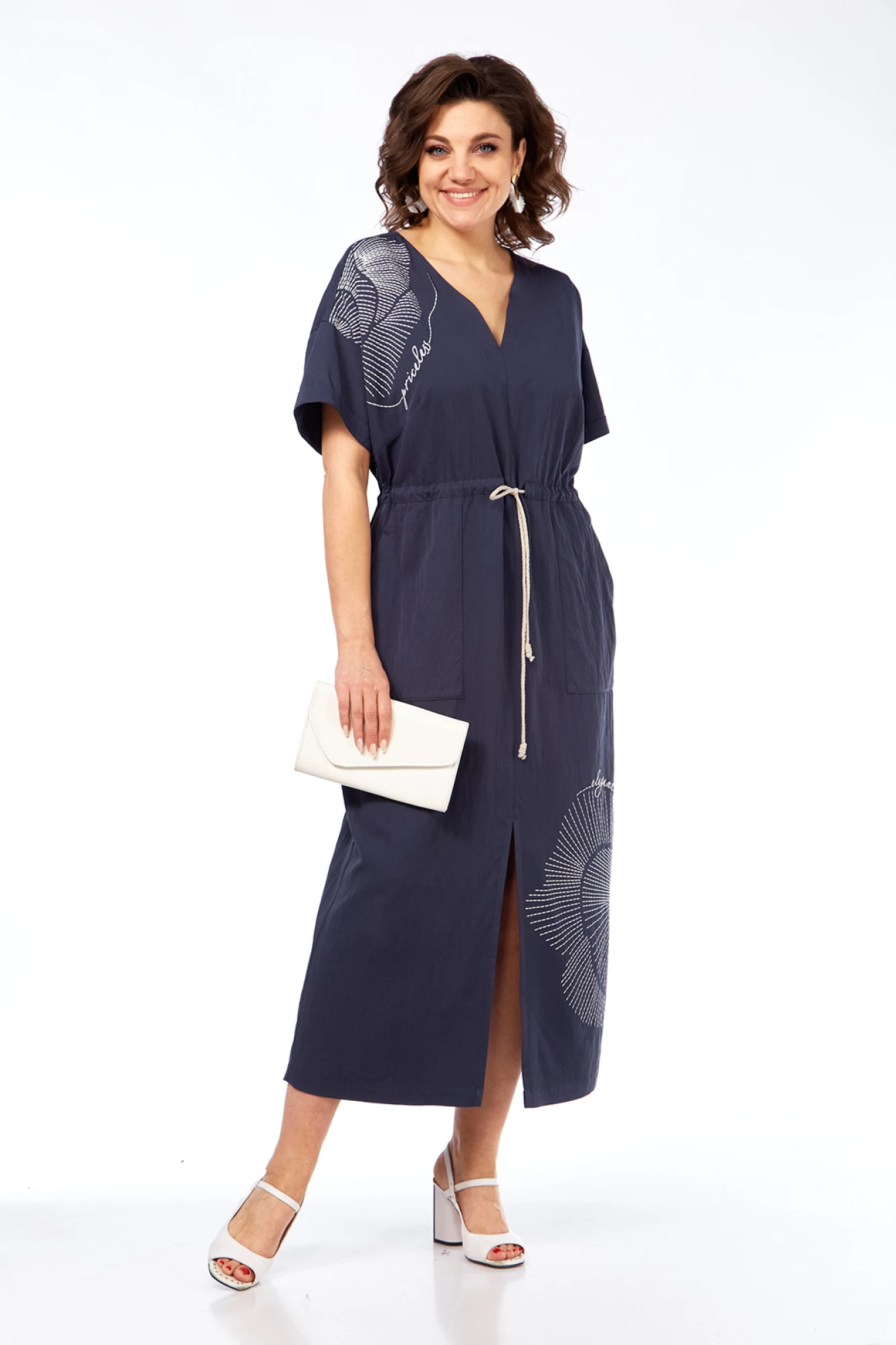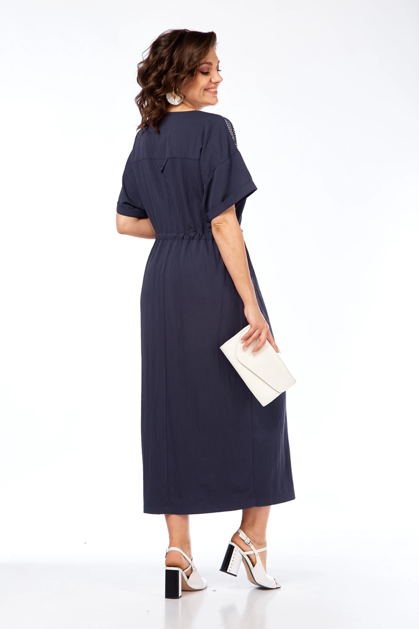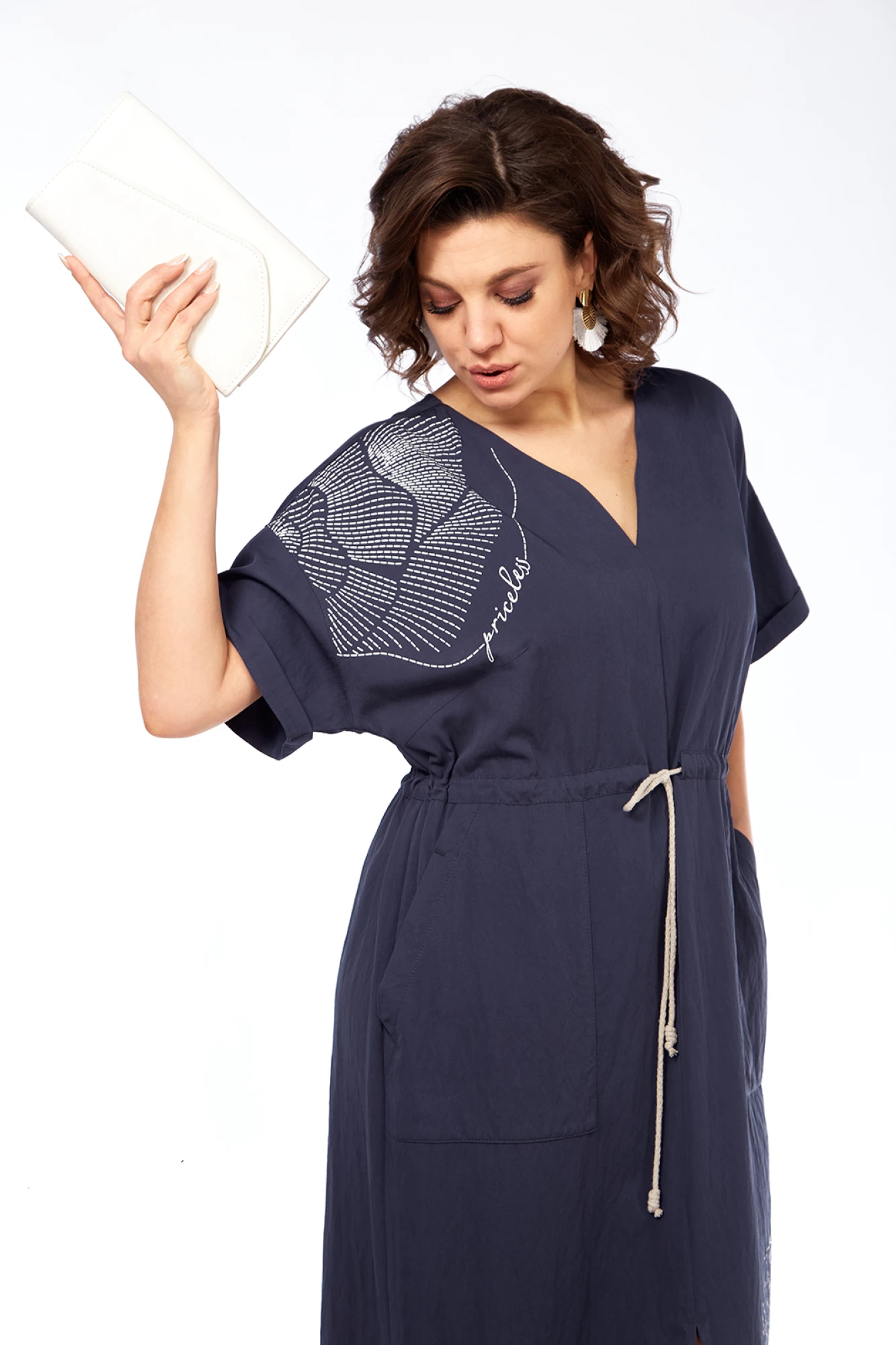 Платье женское, прямого силуэта из плательной ткани. Горловина фигурной формы. По переду средний шов с разрезом внизу. Платье отрезное по талии с кулисой. Обработаны накладные карманы. Рукава спущенные. По спинке кокетка с декоративным элементом и средний шов. Платье декорировано печатью.