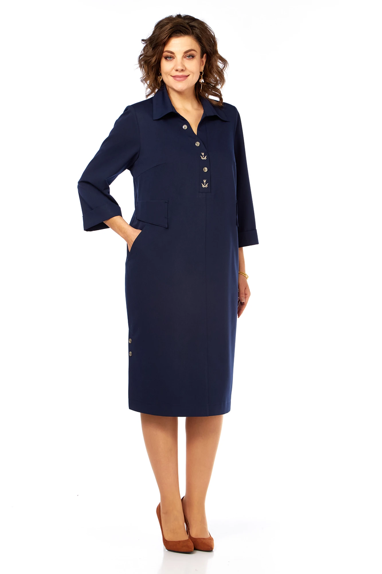 Платье женское прямого силуэта, изготовлено из плательной ткани. По переду нагрудные вытачки и фигурные подрезы с карманами в швах. Горловина оформлена планками с декоративной вышивкой и пуговицами, воротник стояче-отложной. На талии декоративные шлевки и съемный пояс с пряжкой. По спинке кокетка и средний шов. В боковых швах внизу обработаны шлицы декорированы пуговицами.
