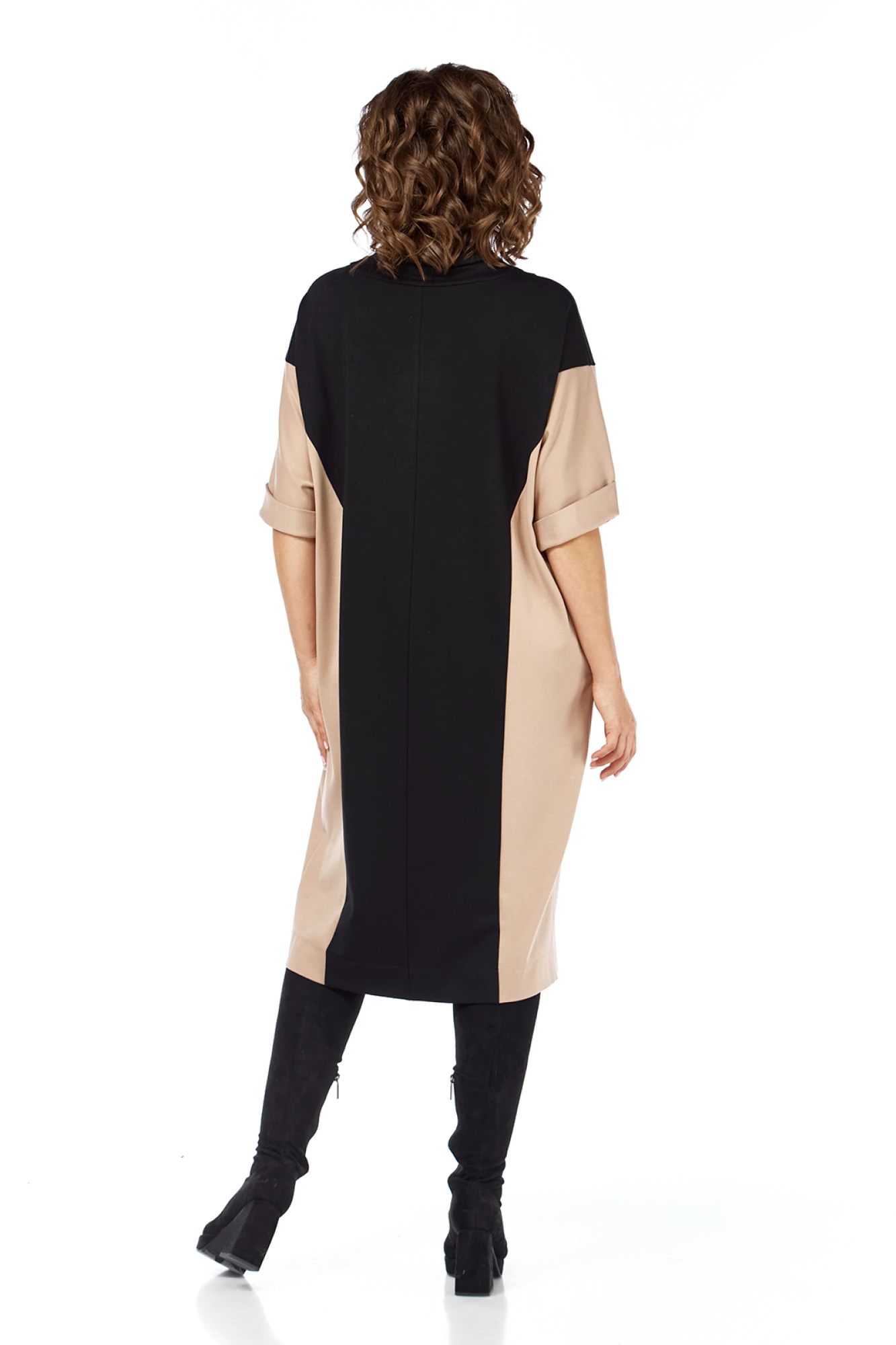 Платье женское свободного силуэта, выполнено путем комбинирования тканей двух цветов, из трикотажного полотна. Изделие с воротником “хомут”. По переду и спинке обработаны фигурные рельефы. Рукава спущенные. В боковых швах имеются карманы.