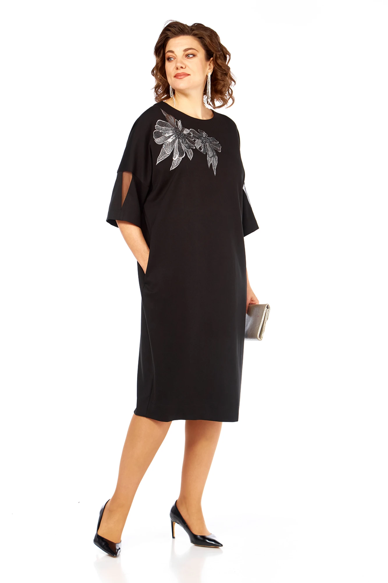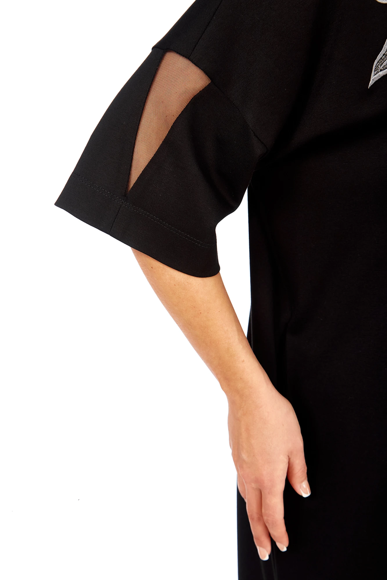 Платье женское нарядное, изготовлено из трикотажного полотна. Горловина круглой формы. На полочке дизайнерская вышивка. Спинка со средним швом и декоративным вырезом с сеткой вверху. Рукава спущенные, длиной ¾ со вставкой из сетки.