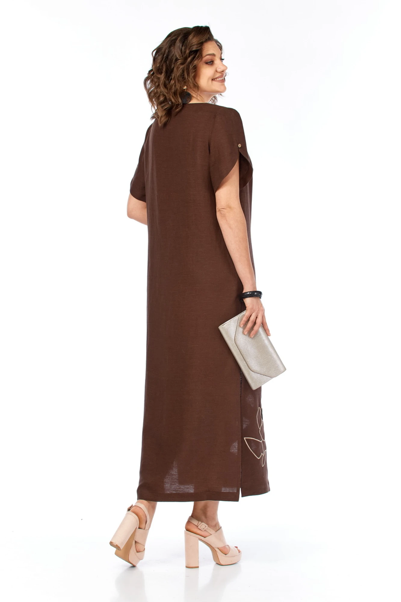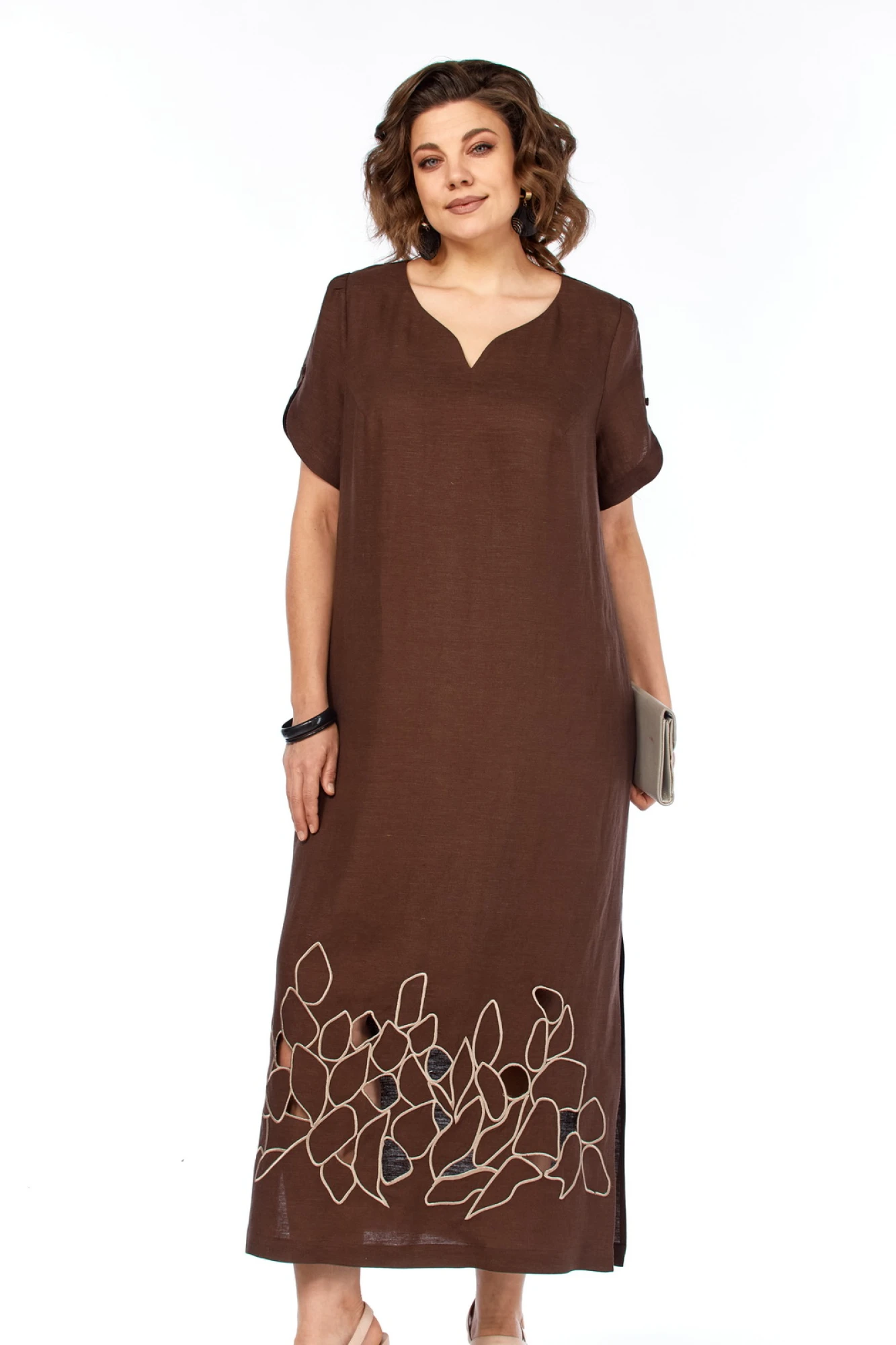 Платье женское, прямого силуэта, выполнено из льняной ткани с фигурным вырезом по горловине. По переду обработаны нагрудные вытачки. Спинка цельнокроенная. Рукава втачные, по окату рукава сборка, нижний срез фигурной формы. Рукав декорирован навесной петлей и пуговицей. Платье дополнено дизайнерской вышивкой в стиле ришелье.