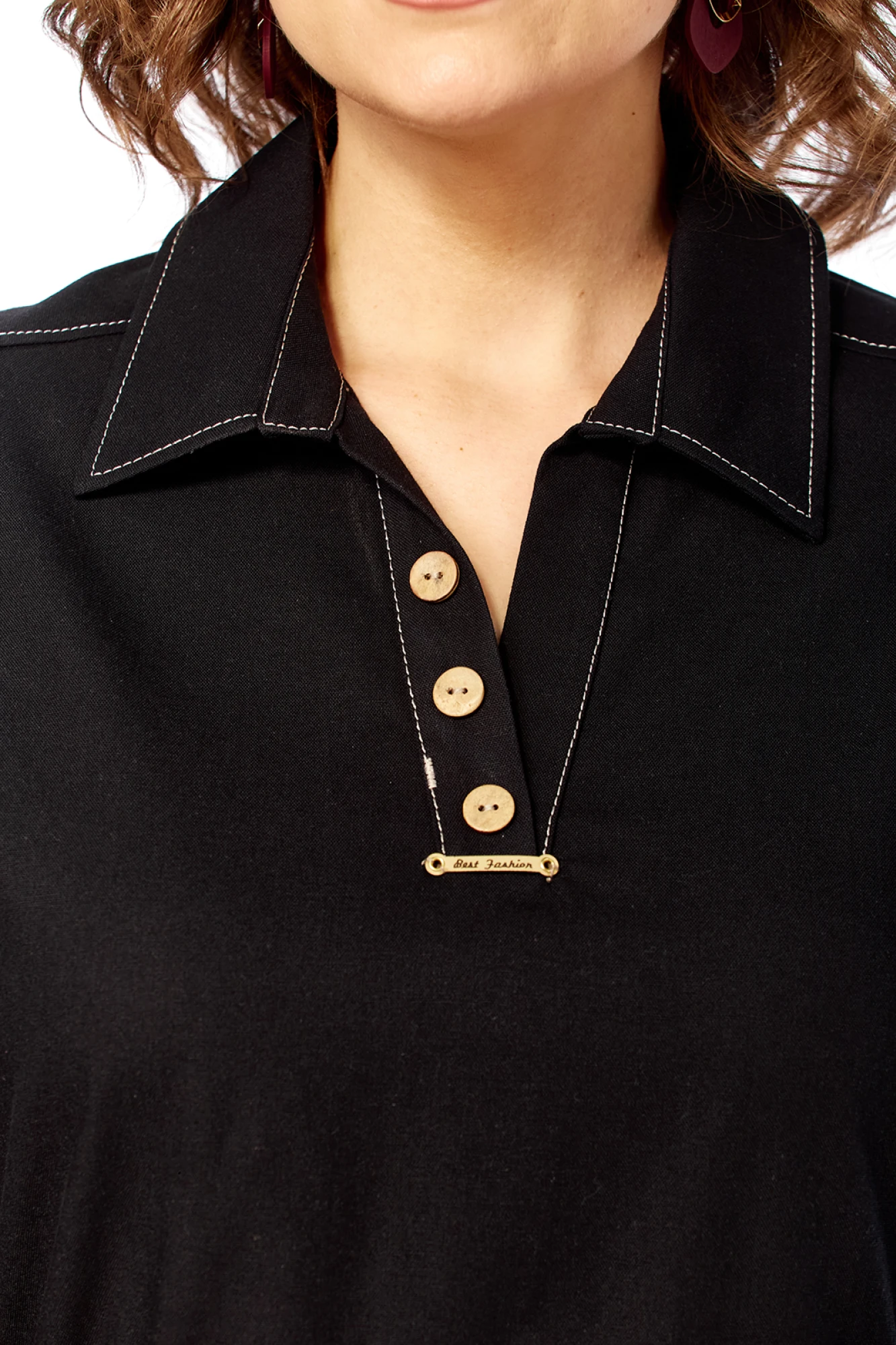 Платье женское, прямого силуэта из плательной ткани. Горловина оформлена воротником и планками, декорированными пуговицами. Платье отрезное по талии с кулисой. Обработаны накладные карманы. Рукав спущенный с отложной манжетой. По спинке кокетка, переходящая на перед. На юбке платья средний шов. В боковых швах разрезы. Платье декорировано отделочной тесьмой и шнуром в цвет тесьмы.