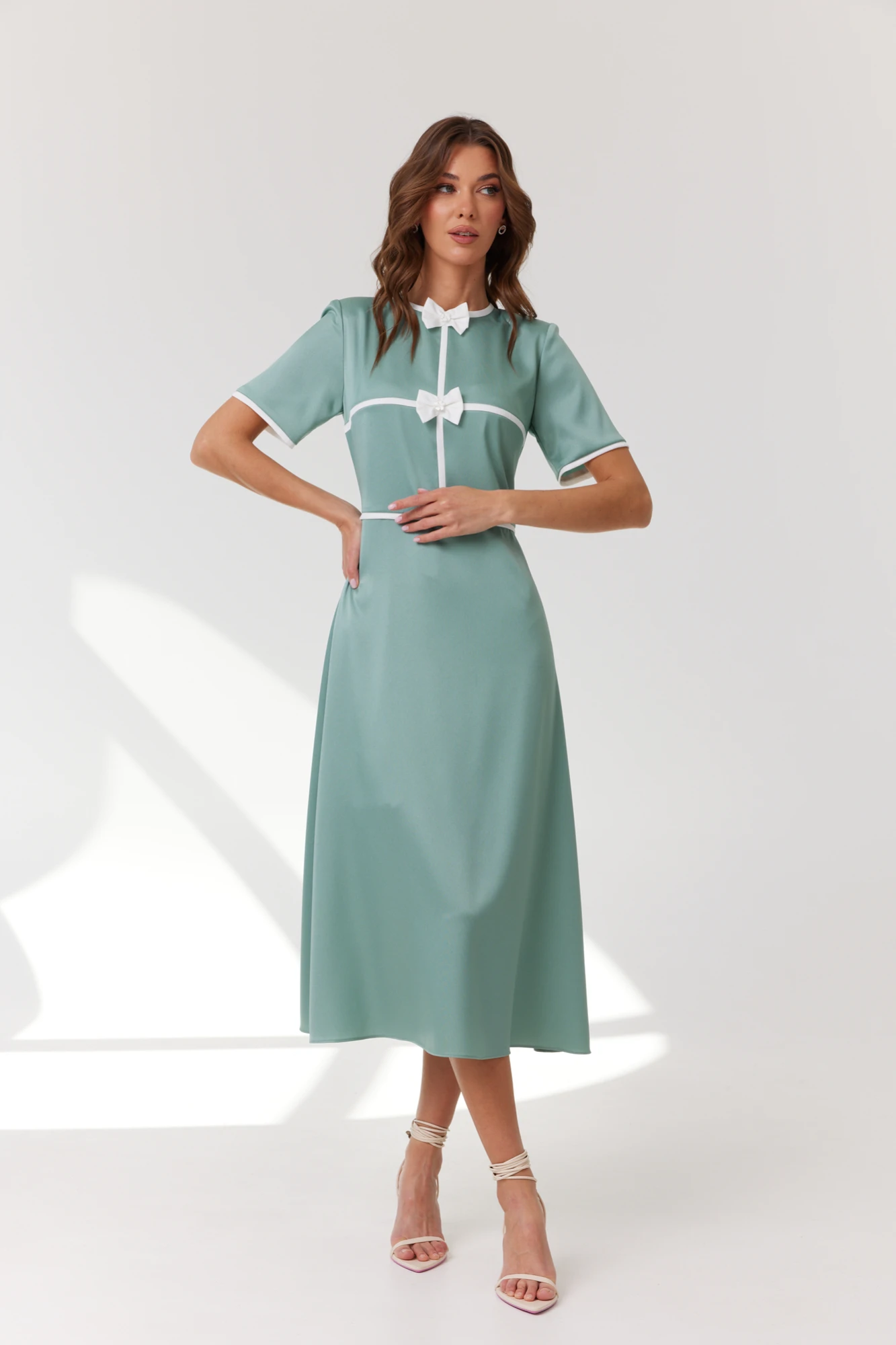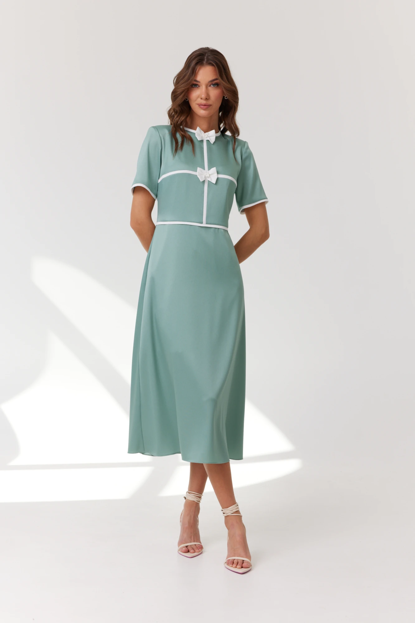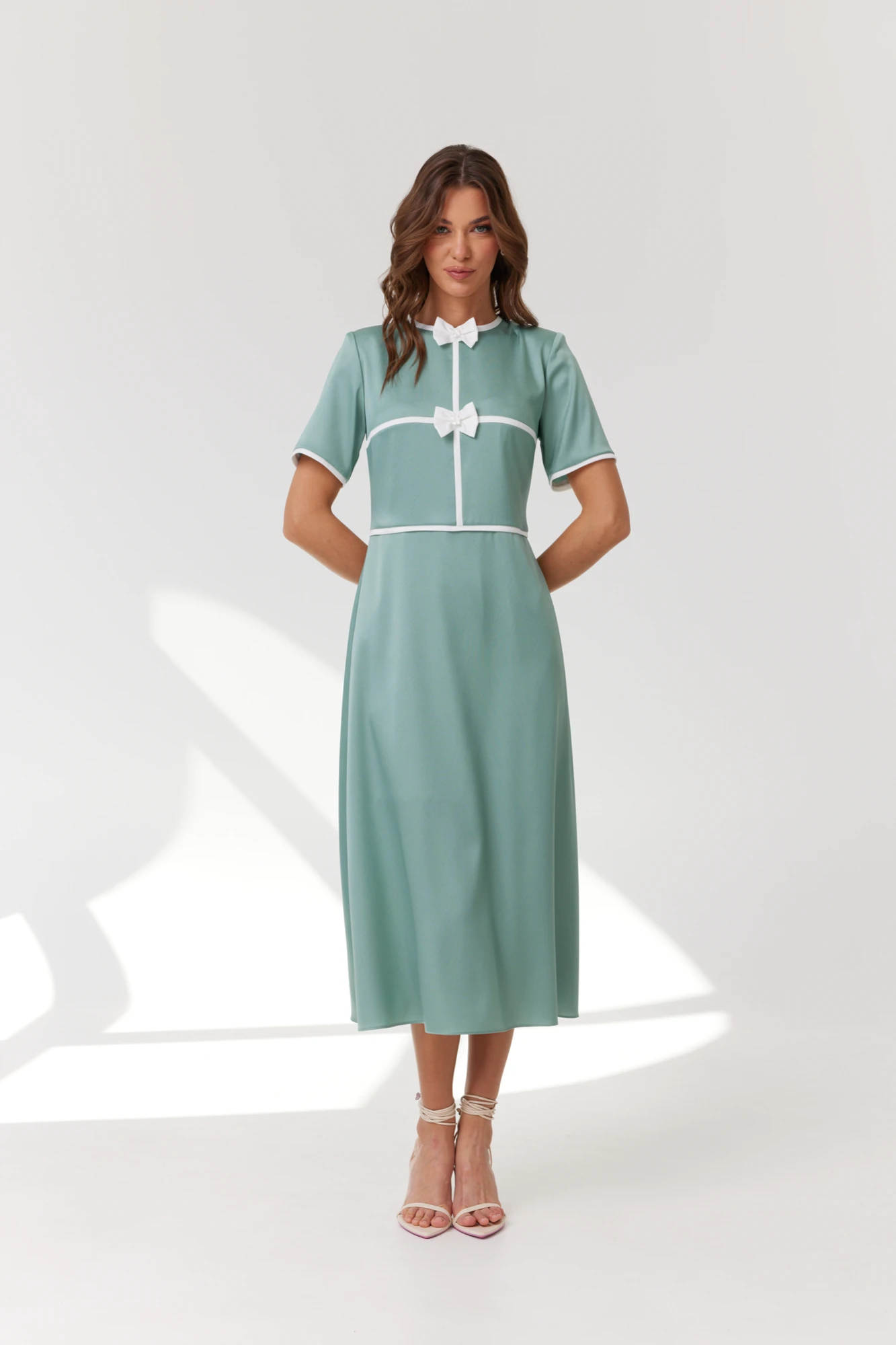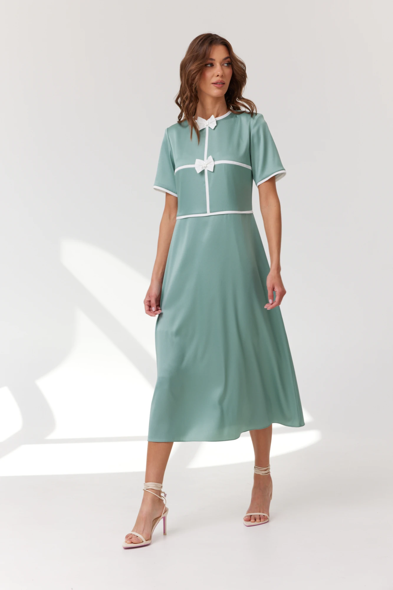 Платье женское полуприлегающего силуэта, отрезное по линии талии.Лиф переда разрезной, со вставками из ткани-компаньона и декоративным украшением в виде бантиков. Спинка лифа с плечевыми вытачками, со средним швом, в котором обработана застежка на потайную молнию. Юбка платья расширенной А-образной формы. Горловина округлой формы, обработана бейкой из ткани-компаньона. Рукав короткий одношовный, По низу обработан бейкой из ткани-компаньона. Декоративные элементы и фурнитура могут отличаться от заявленных на фото. Цвет материала может отличаться по тону в зависимости от настроек вашего монитора!
