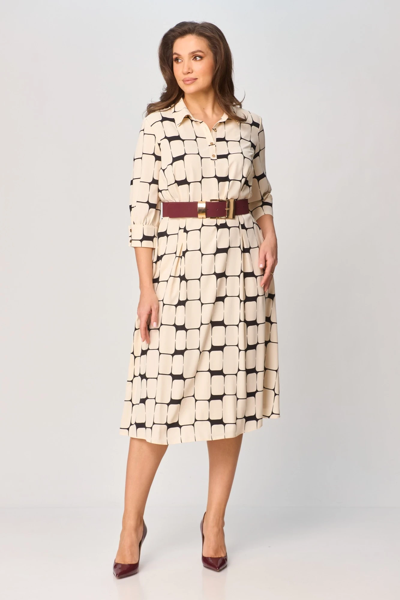 Платье женское полуприлегающего силуэта. Воротник классический, по переду планка с пуговицами. Рукав втачной собранный на манжету. Карманы в боковых швах. Декоративный ремень в комплекте .