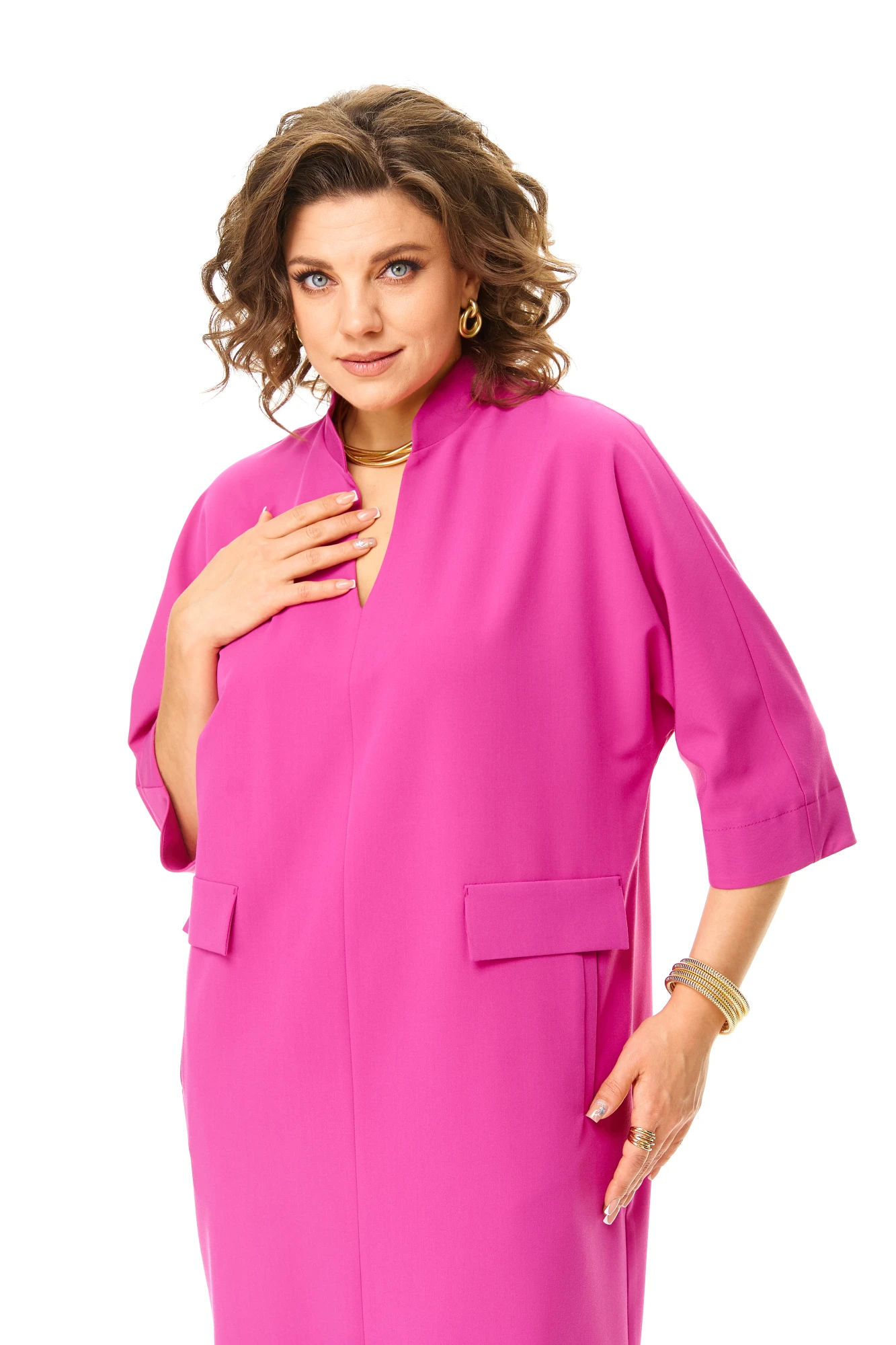 Платье женское, выполнено из плательного текстильного полотна. Покрой рукава цельнокроеный с передом. По переду центральный шов. Горловина V- образная, небольшой воротник стойка. На деталях переда настрочены декоративные клапаны. В боковых швах разрезы. Спинка со средним швом без особенностей. Платье без подкладки, без застёжки. Длина рукава 3/4