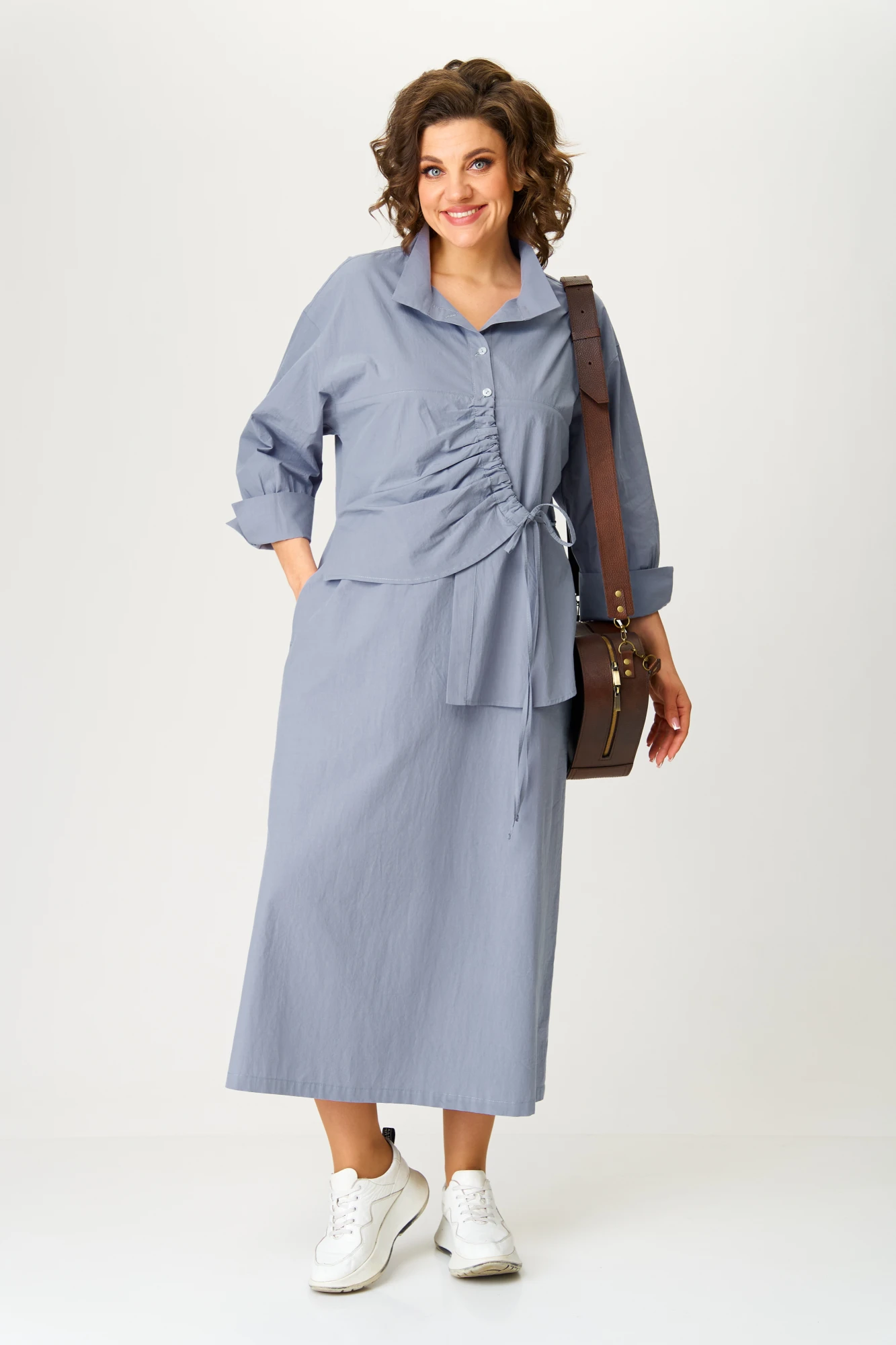 Силуэт прямой. Покрой свободный. Линия плеча спущена. Низ рукава обработан манжетой. Карманы в боковых швах. Справа в боковом шве высокий разрез. Воротник стойка, застежка центральная на петли и пуговицы. По переду выполнены декоративные элементы типа имитации "" рубашки и юбки"". По переду горизонтальный подрез в области груди. Спинка прямая со средним швом и небольшим декором.