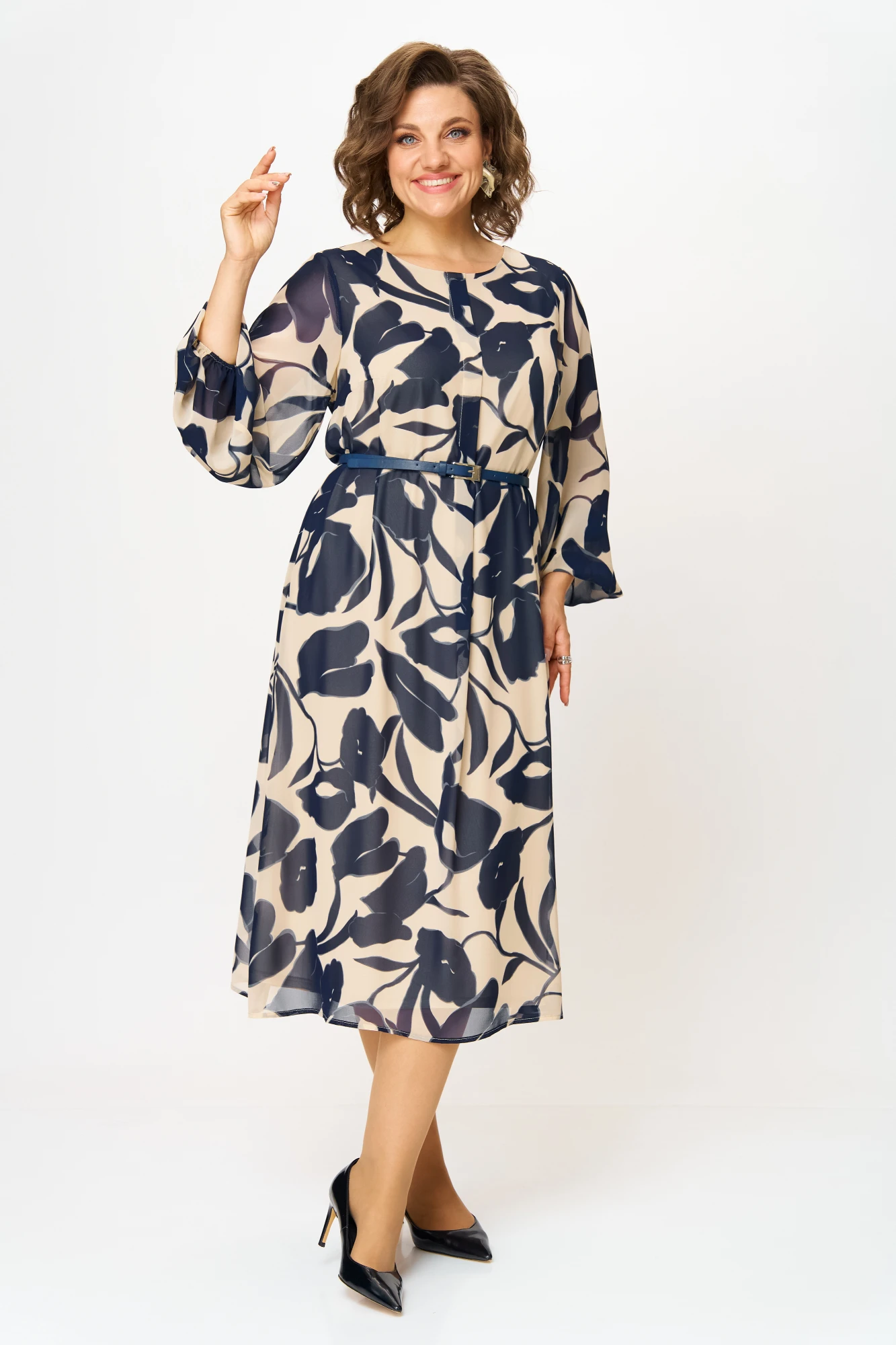 Платье выполнено из шифона с цветочным принтом. Силуэт прямой, чуть расширен к низу. По переду в горловину входит складка, складка частично настрочена. По переду есть нагрудные вытачки. Перед и спинка на трикотажной подкладке. Рукав втачной, прямой, к низу расширен. Низ рукава на резиночке. Спинка со средним швом, без особенностей. Съёмный пояс в комплекте.