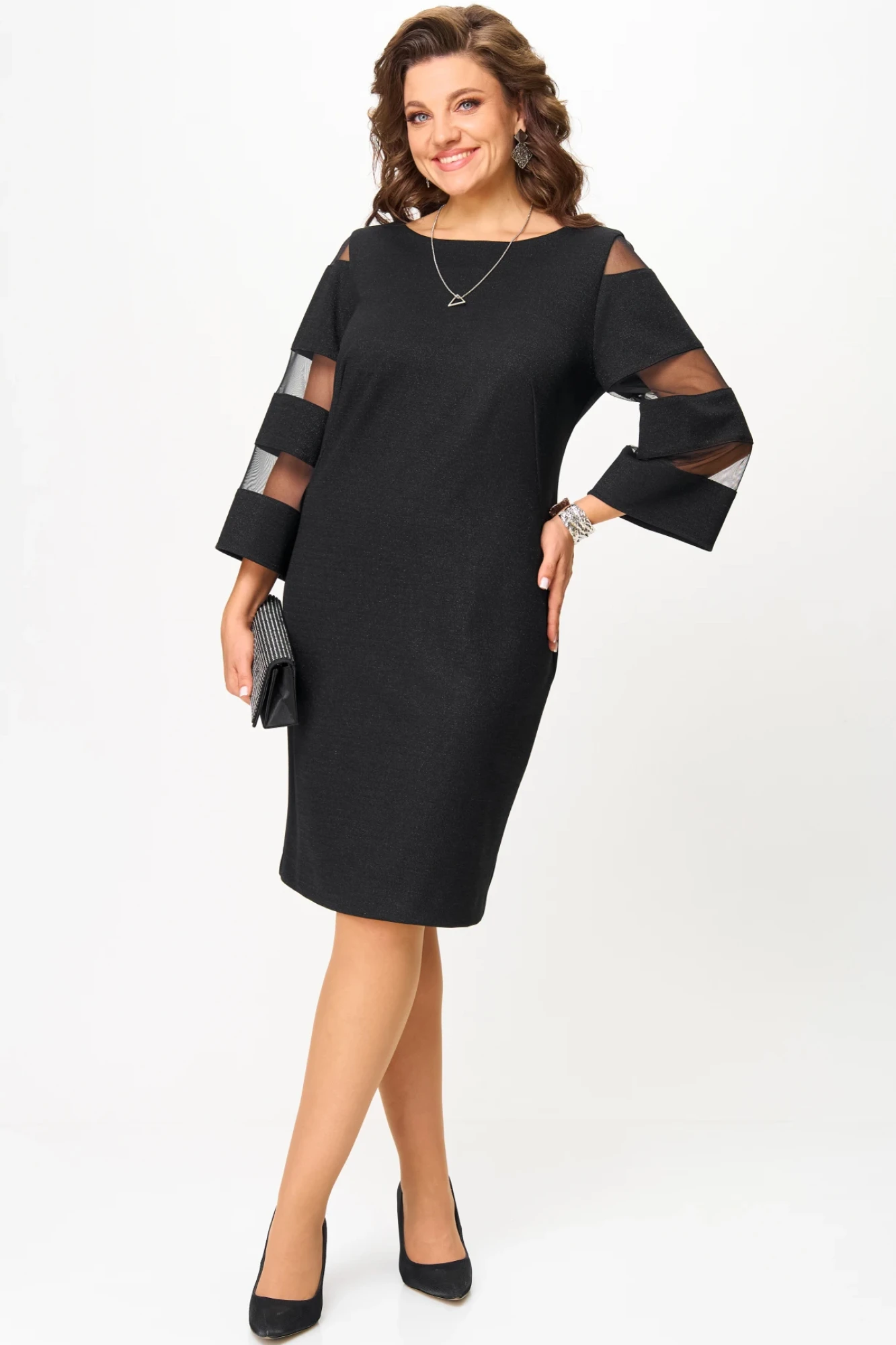 Силуэт прямой. Рукав втачной, слегка расширенный к низу. По рукаву вставлена сетка. Спинка со средним швом, шлица для хода. Платье без застёжки, без подкладки.