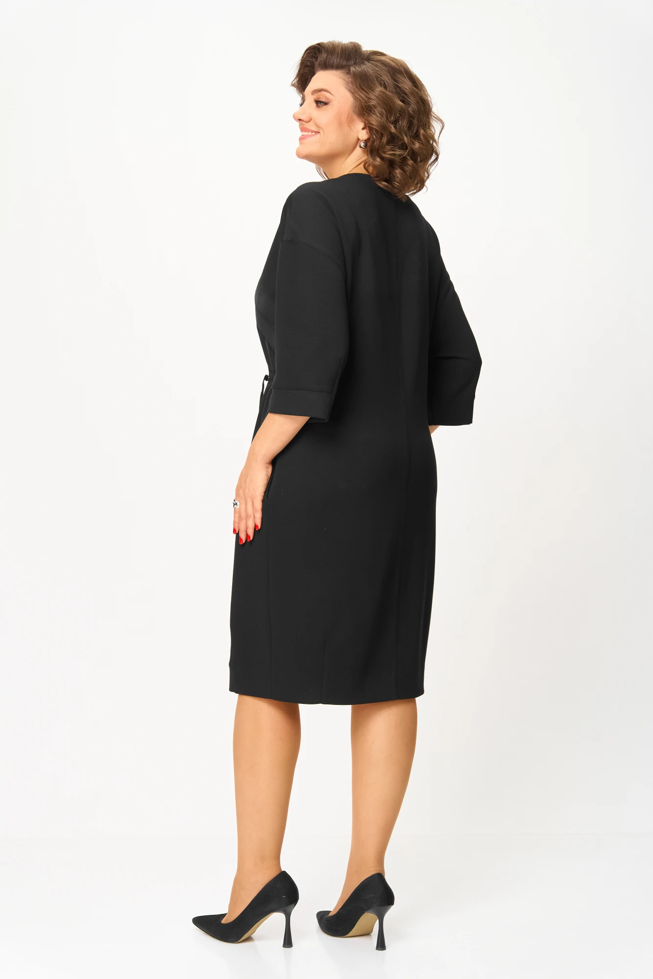 Платье женское, выполнено из трикотажного полотна с декоративными вставками из сатина в цвет основного полотна. Силуэт прямой, приталенный за счёт кулисы по передней части платья.