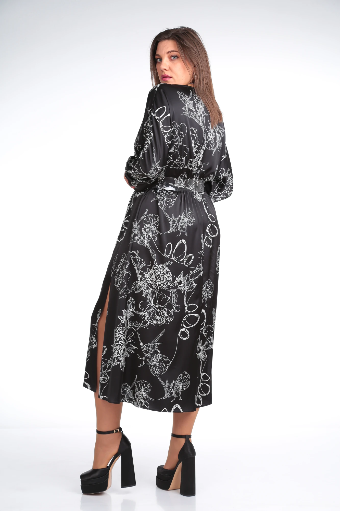 Платье женское из атласного сатина с V-образным вырезом горловины. Покрой рукава цельнокроеный с лифом. Низ рукава собран на резиночку. Боковой шов переходит на перед, заканчивается разрезом. Платье без подкладки. Ремень входит в комплект и может незначительно отличаться от фото с сохранением художственного замысла.