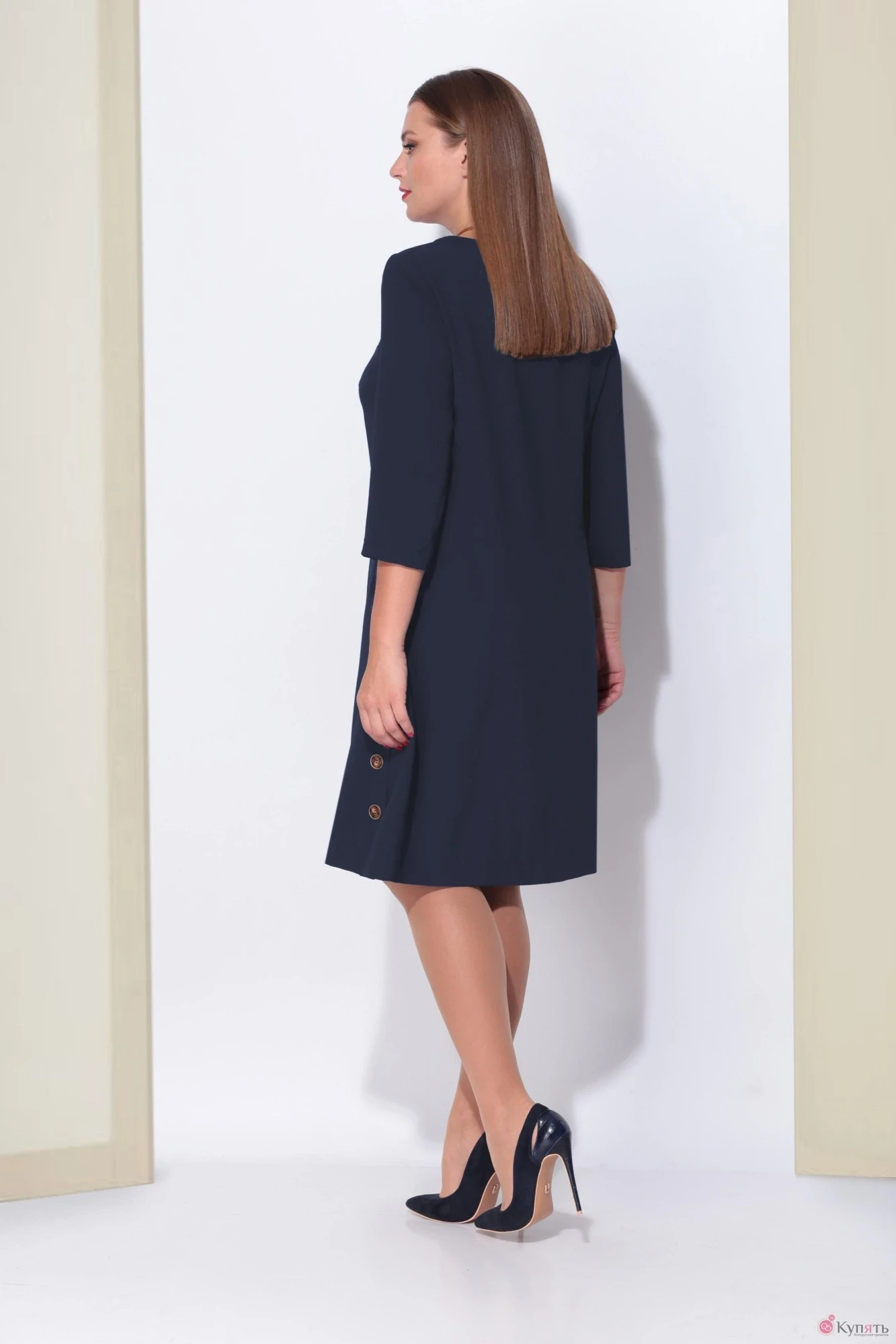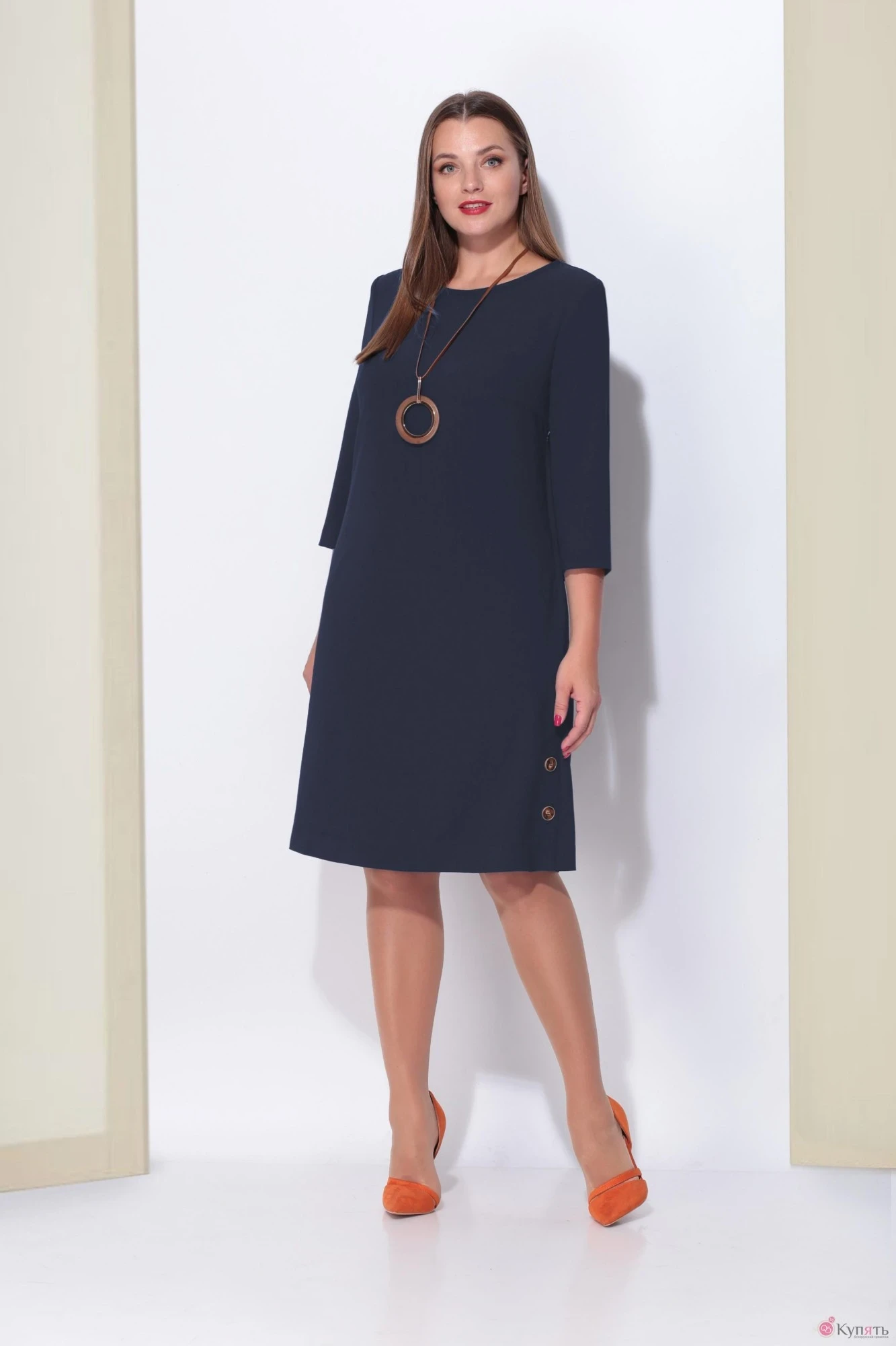 Платье женское слегка расклешенное к низу на подкладке. По полочке нагрудные воточки. Боковые швы переходят в шлицы декорированные двумя пуговицами. Вырез горловины круглый с планкой в виде рулика. Рукав втачной двухшовный. В комплекте идет декоративное украшение ввиде кулона.