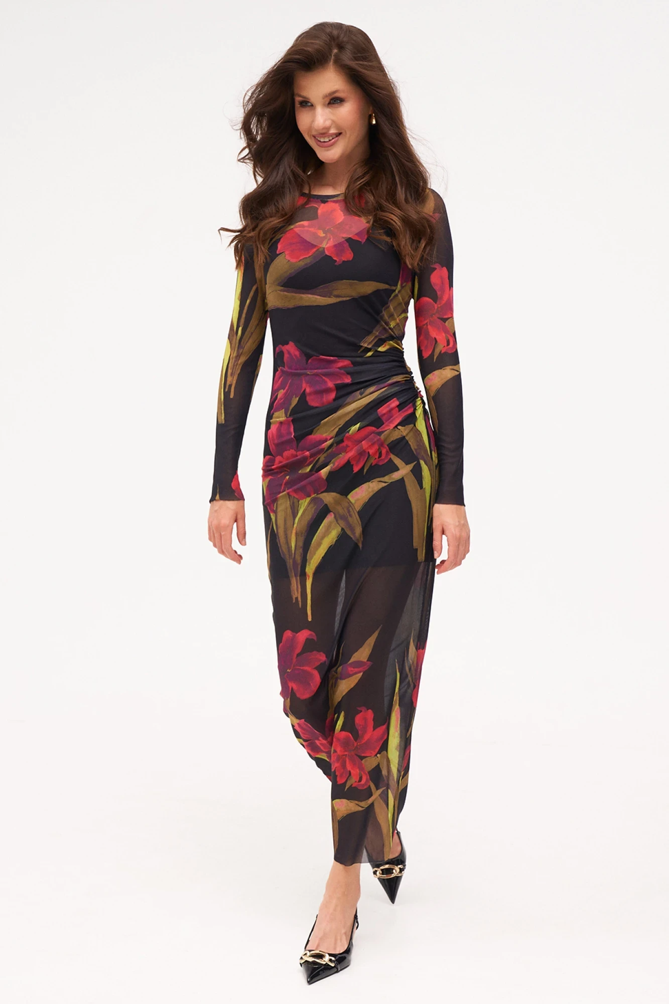 Платье облегающее из эластичной, прозрачной сетки в яркий принт со сборкой по боковому шву в области талии. Комплектуется нижним платьем-комбинацией.