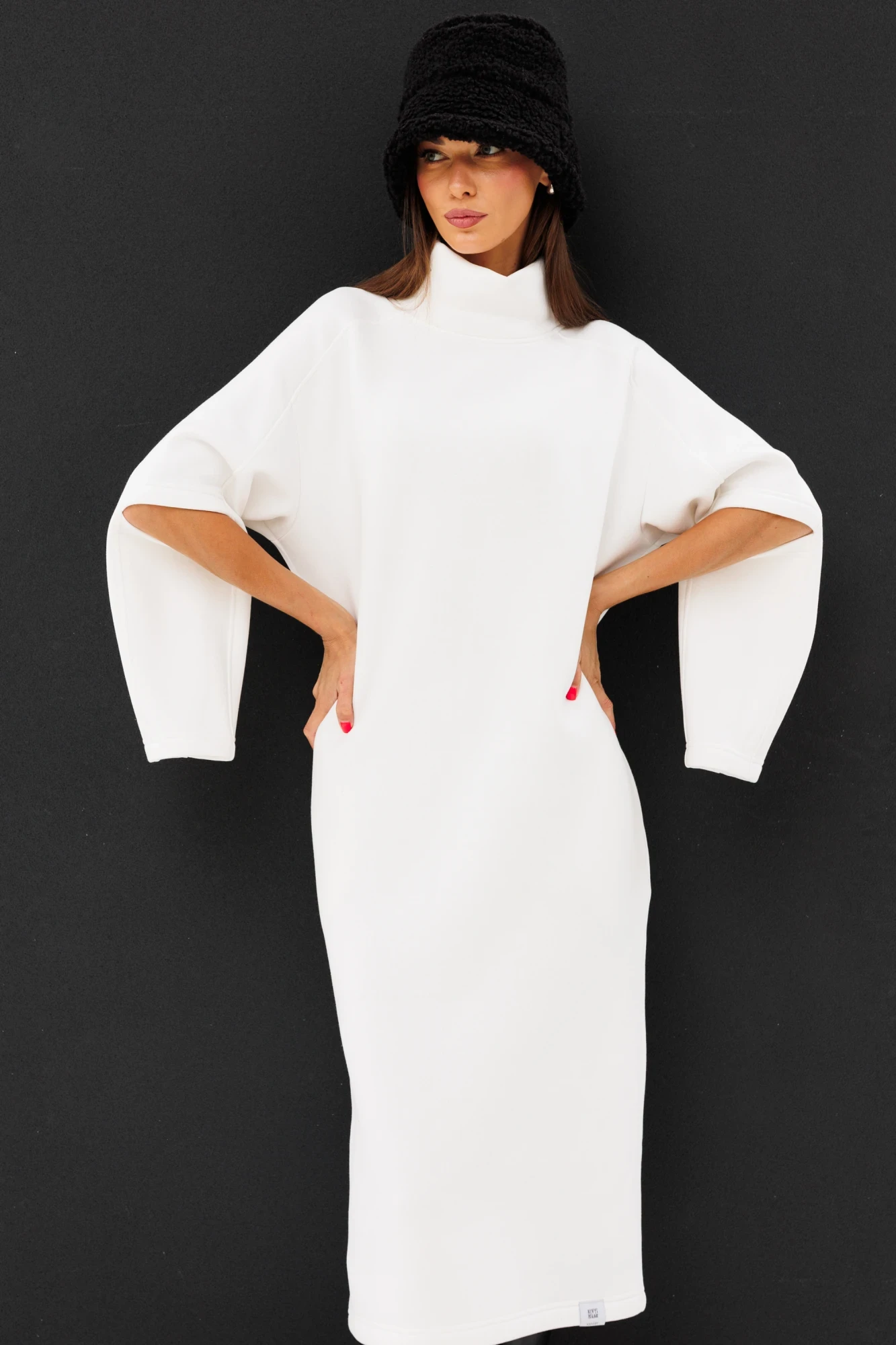 Теплое модное платье в стиле Kivvi wear. Платье с разрезами в рукавах на уровне линии локтя, карманами в боковых швах, рукавом реглан и воротником-стойкой. Платье выполнено из мягкой и теплой ткани, которая хорошо сохраняет тепло и не сковывает движения. Разрезы в рукавах придают платью оригинальность и позволяют носить его с разными аксессуарами, например, с браслетами или перчатками. Карманы в боковых швах - это удобный и практичный элемент, который позволяет хранить мелочи или согревать руки. Рукав реглан - это рукав, который начинается от воротника и идет до низа подмышки, создавая эффект объема и свободы. Воротник-стойка - это воротник, который поднимается над шеей и защищает от холода и ветра.