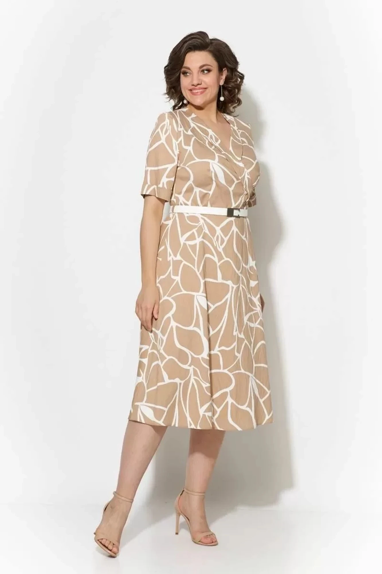 Нарядное удлиненное женское платье из принтованной ткани с эффектом легкого крэша, с добавлением вискозы. Отрезное по линии талии, юбка расширенная к низу. Лиф с воротником "шалька" на запах. Рукав короткий с небольшим отворачивающимся манжетом. В качестве декора использован ремень.