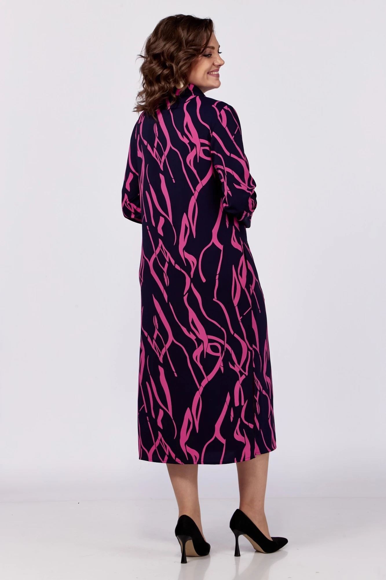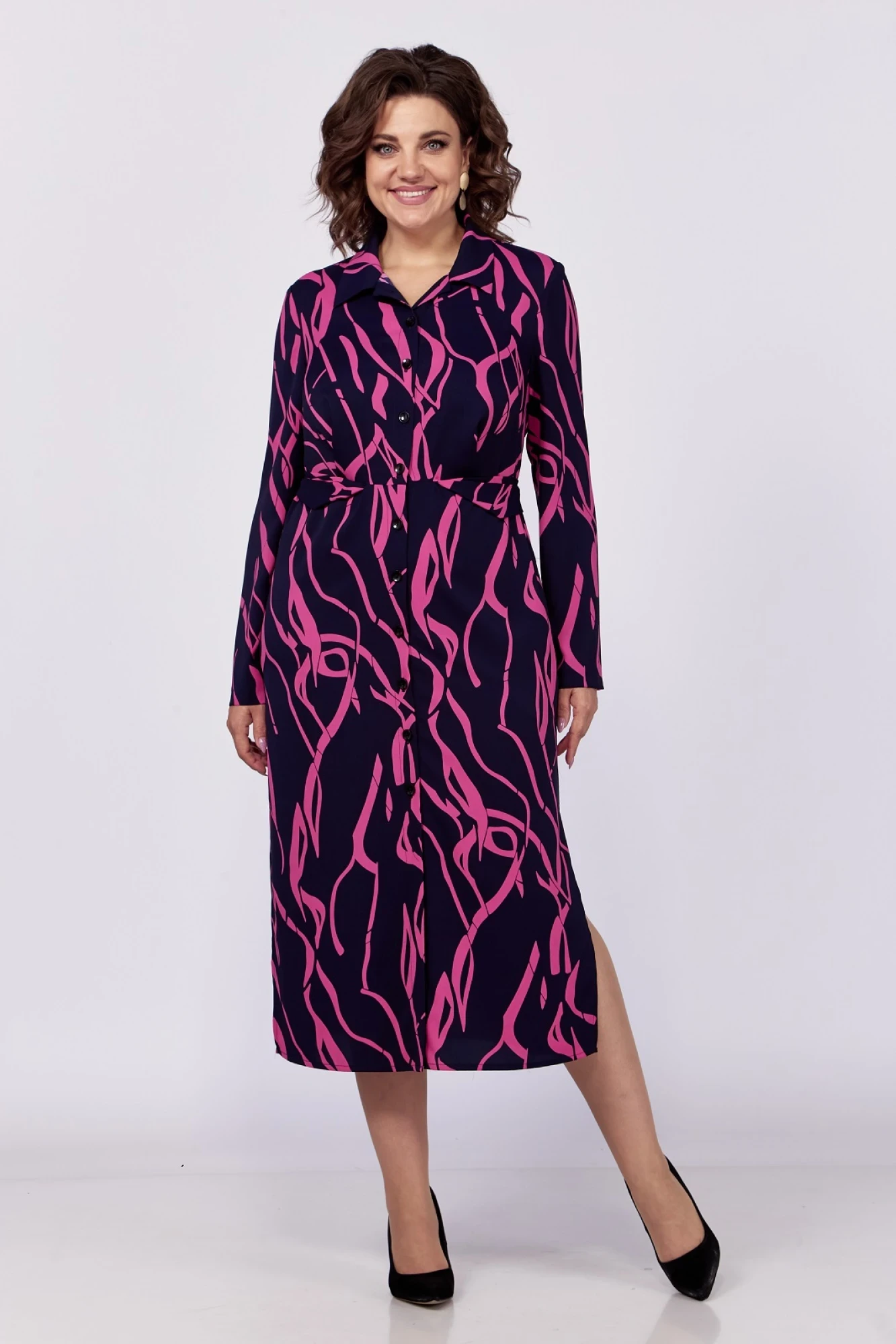 Элегантное, удлиненное женское платье из мягкой непрозрачной ткани с современным принтом. Силуэт прямой, по переду центральная застежка на пуговицы, по линии талии подрез с декоративным элементом в виде пояса, воротник рубашечного типа, в боковых швах карманы и разрезы по низу. Рукав длинный.
