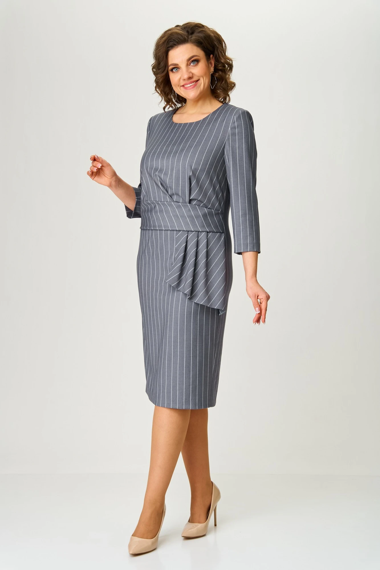 Элегантное женское платье из плательной ткани в тонкую полоску, с добавлением вискозы. Силуэт полуприлегающий, длина чуть ниже колена, вырез горловины круглый, с застежкой на потайную молнию по спинке, рукав 3/4, в среднем шве по спинке невысокий разрез. Оригинальность модели в интересном конструктивном решении переда платья - глубокие складки на талии, имитация пояса с другим направлением полоски и отлетная ассиметричная деталь.