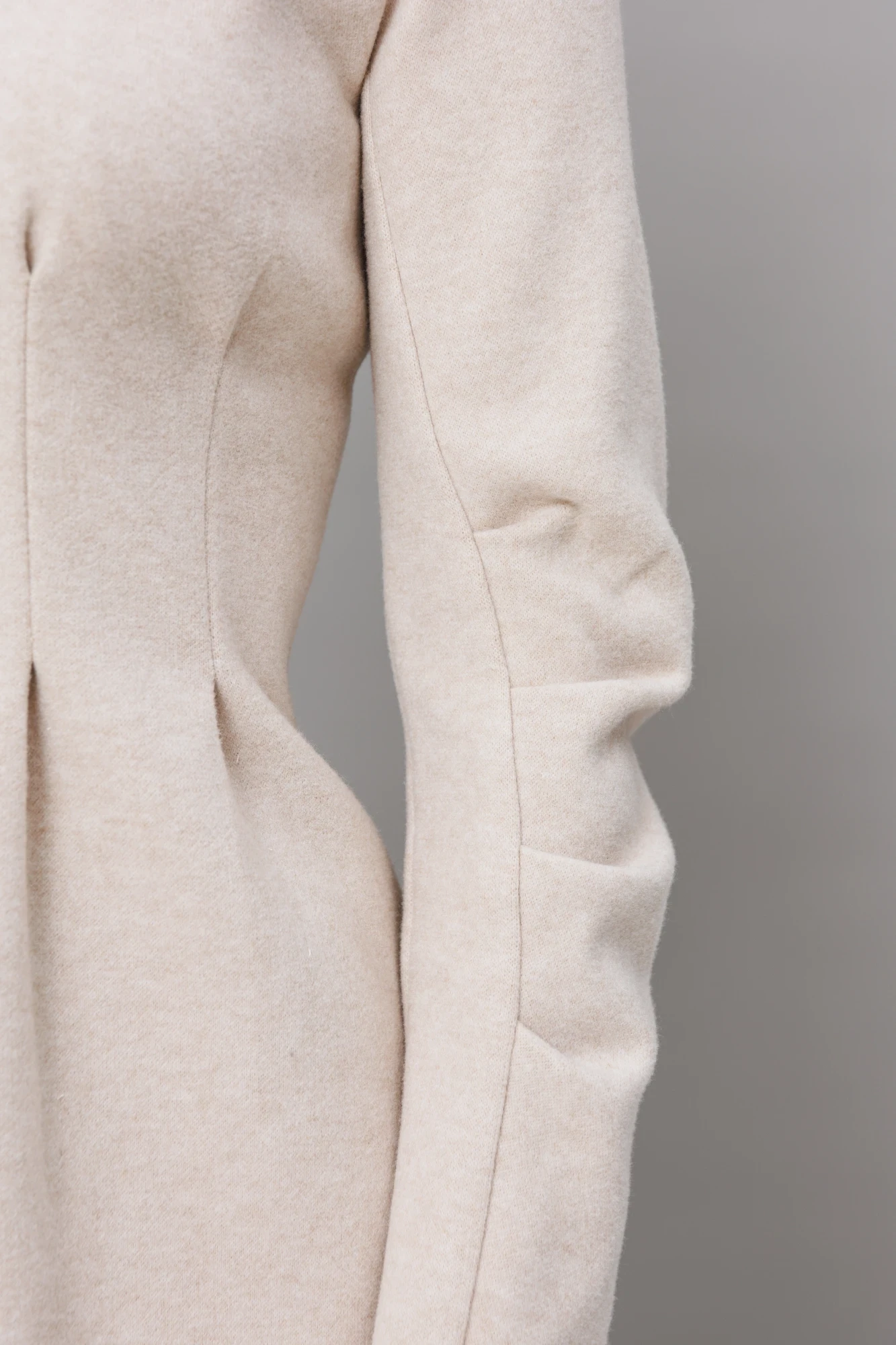 Платье силуэта песочные часы. По переду и спинке вытачки имитирующие корсет. Рукав длинный со складками. Застежка сзади на потайную молнию. В комплекте идет брошь. Длина - 82 см