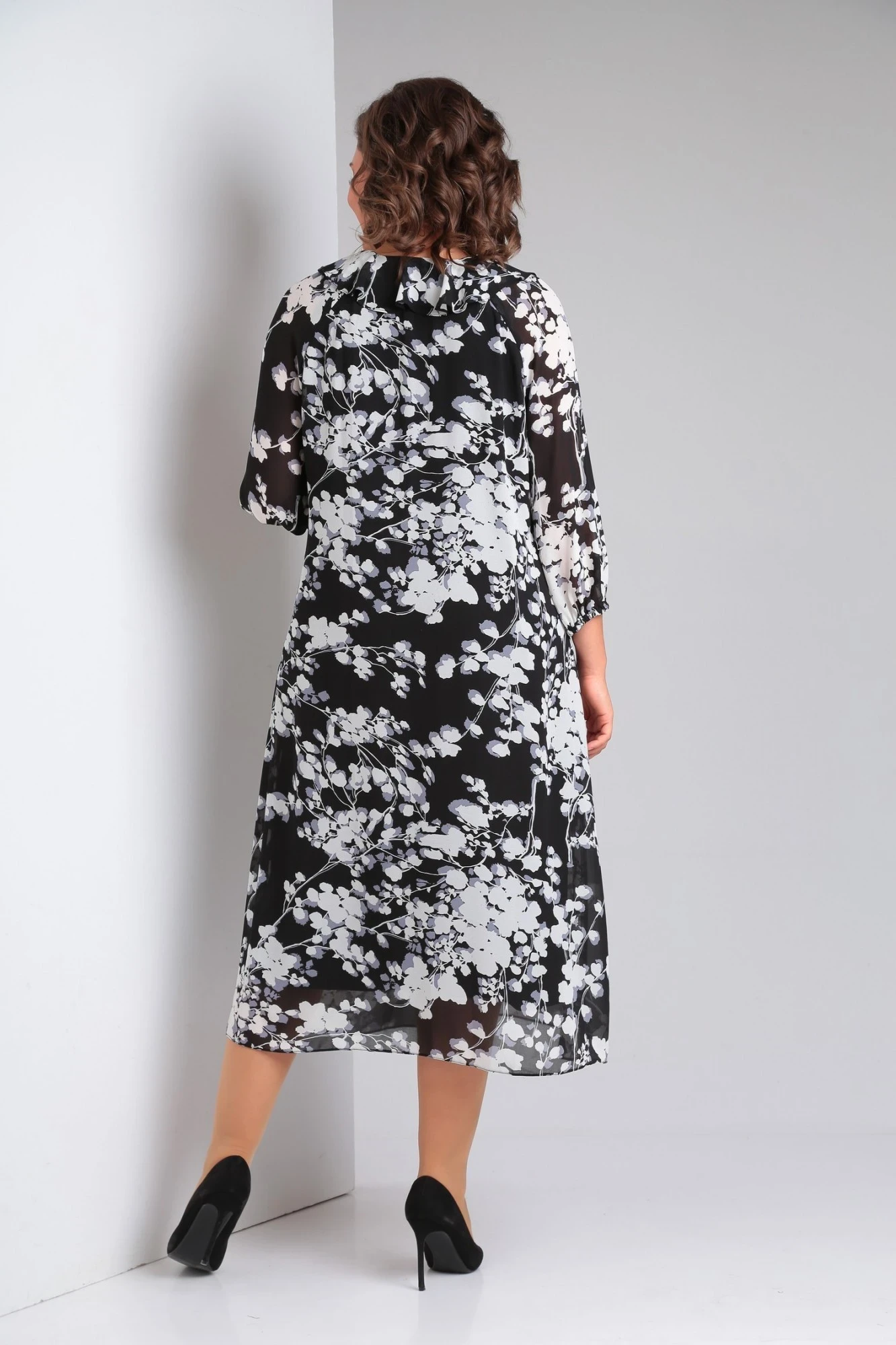 Женское платье А-образного силуэта из шифона. Горловина V-образная, от правого плеча по горловине и по косой до талии вставлен декоративный волан. Рукав реглан, одношовный, снизу на тонкой резинке. Платье на подкладке.