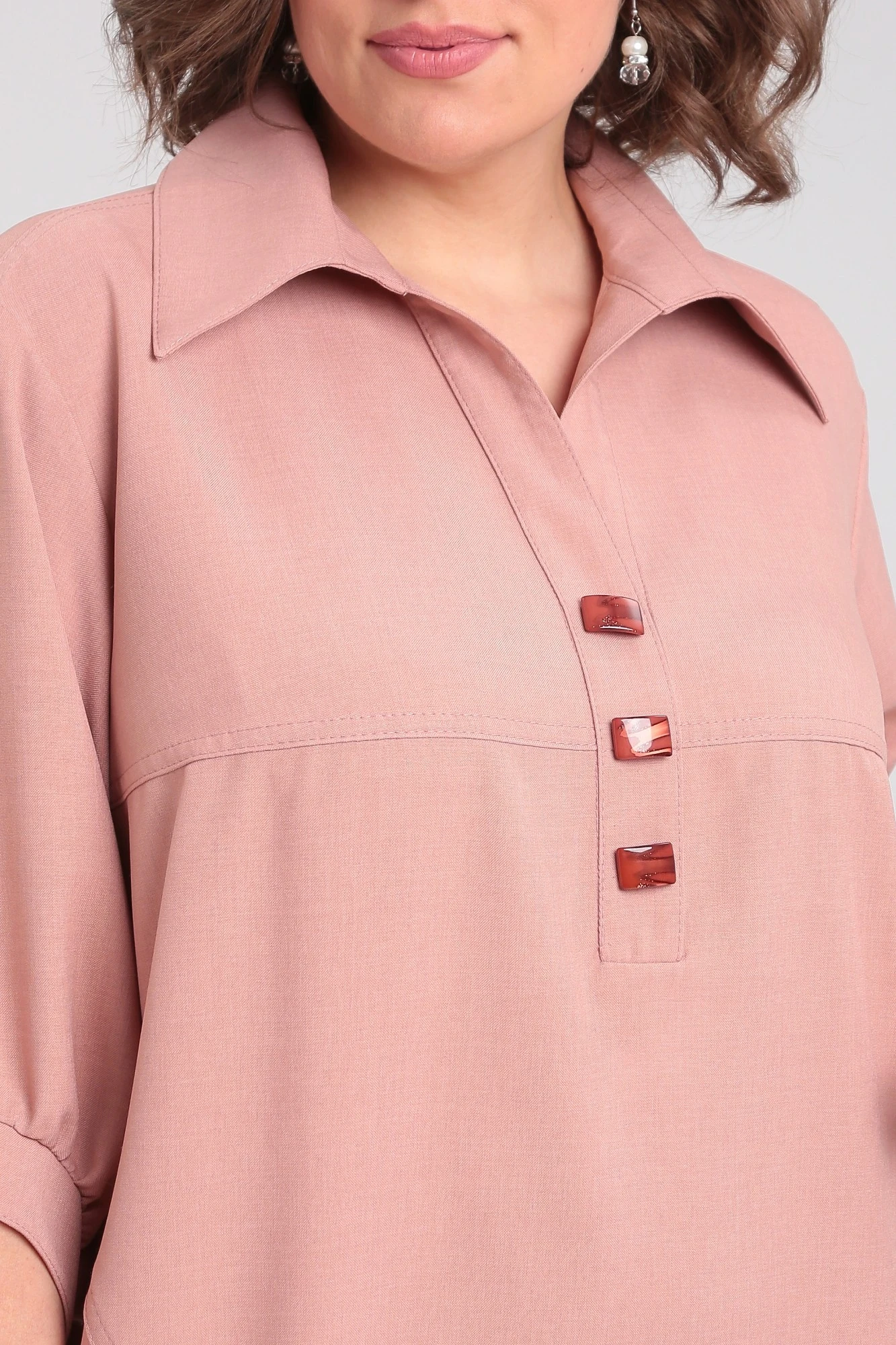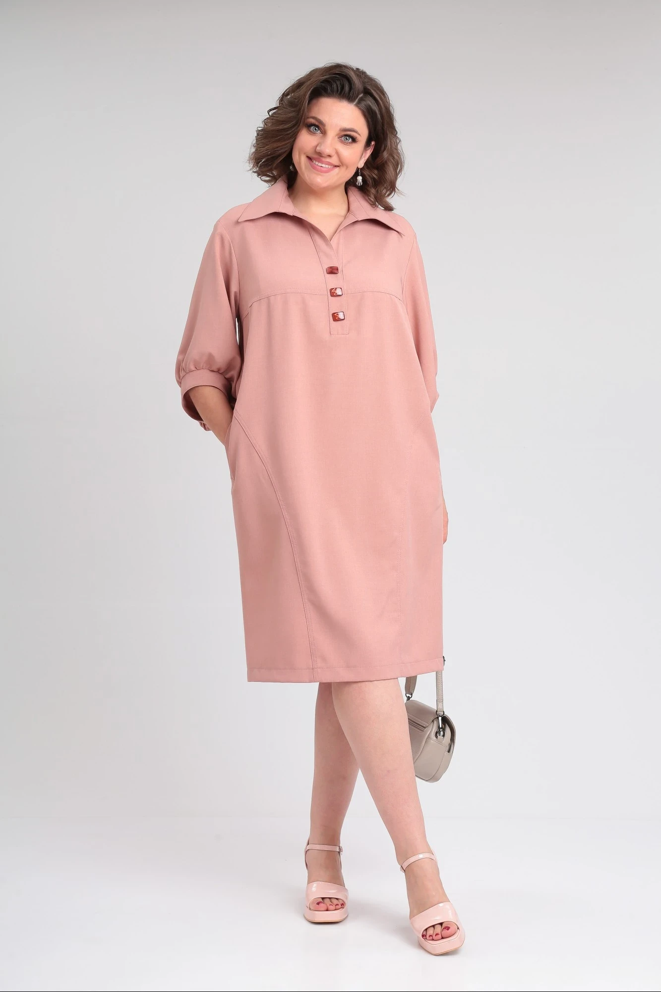 Платье свободного силуэта с рельефами и прорезными карманами с листочками, воротник рубашечного типа на стойке. Выполнен из летней ткани "лён-вишер". Вырез декоративная планка, рукав втачной со сборкой на фигурной манжете.