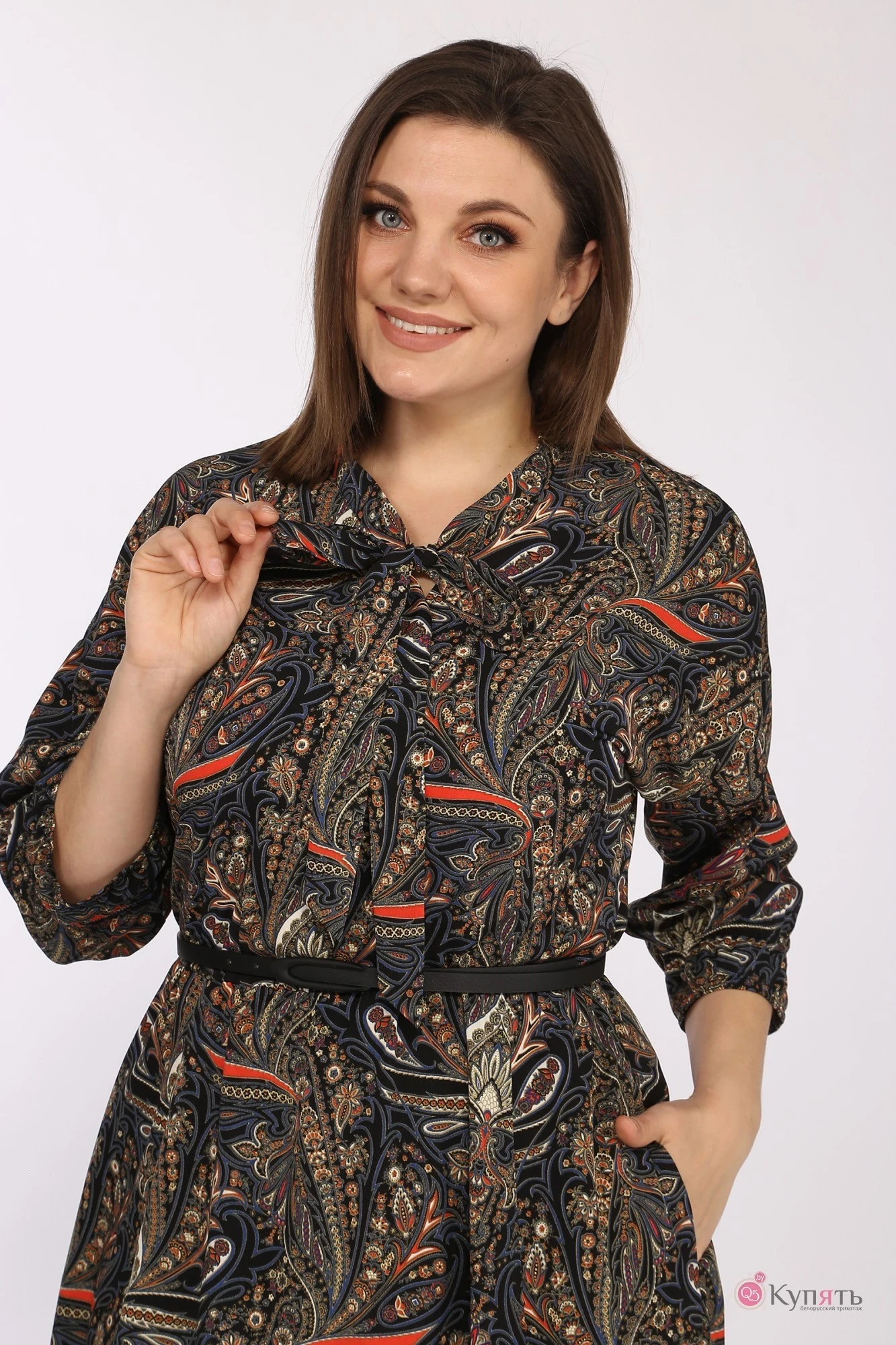Платье женское, А-силуэта, из штапеля. Отрезное по линии талии, собранное на эластичную тесьму. Вырез горловины обработан бантом - галстуком. Со спущенной линией плеча, рукавами 3/4. Низ рукавов собран на двойную эластичную тесьму. Переднее полотнище юбки из 3-ех частей, по талии с встречными складками. Верхняя часть платья и заднее полотнище юбки цельные. Платье комплектуется съемным поясом.Размеры 48-52: длина платья 119 см, длина рукава 42 см. Размеры 54-58: длина платья 121 см, длина рукава 43 см