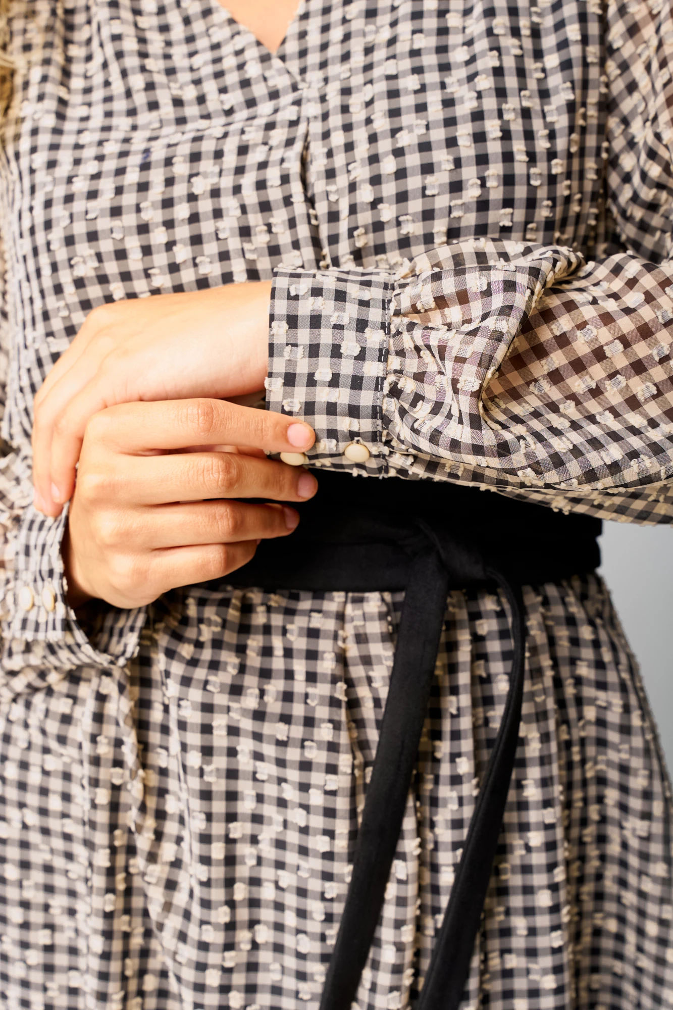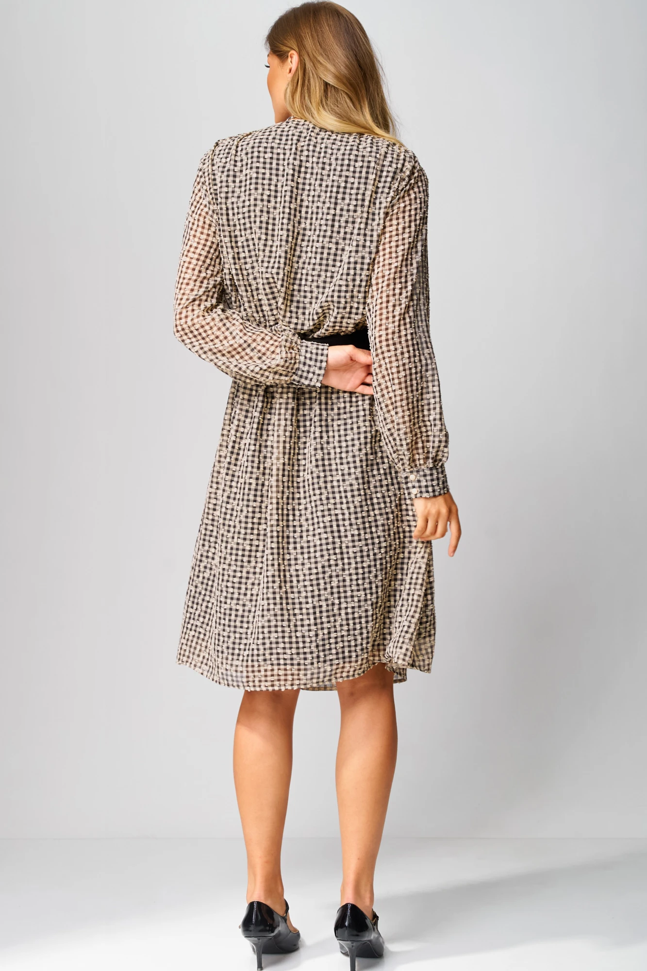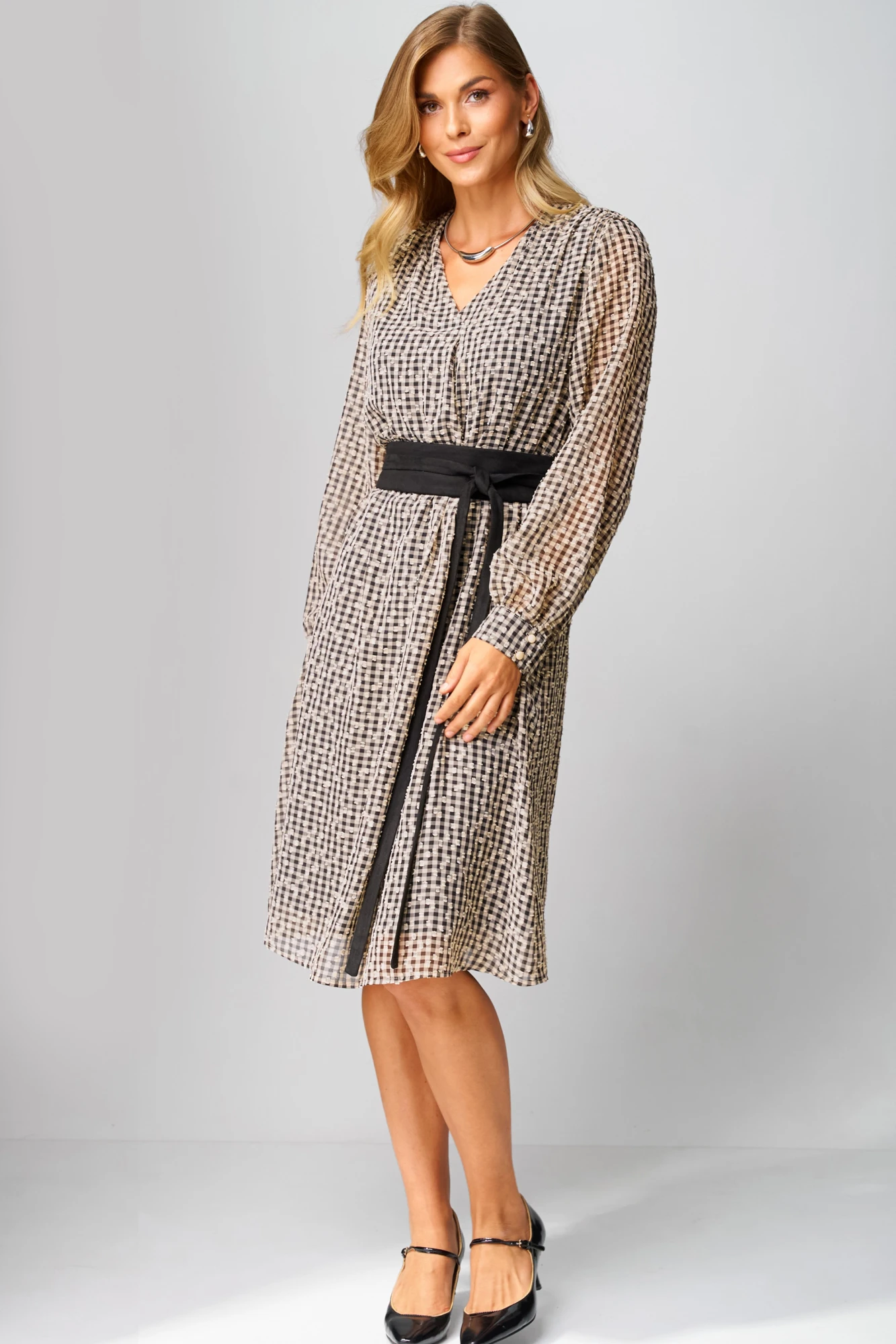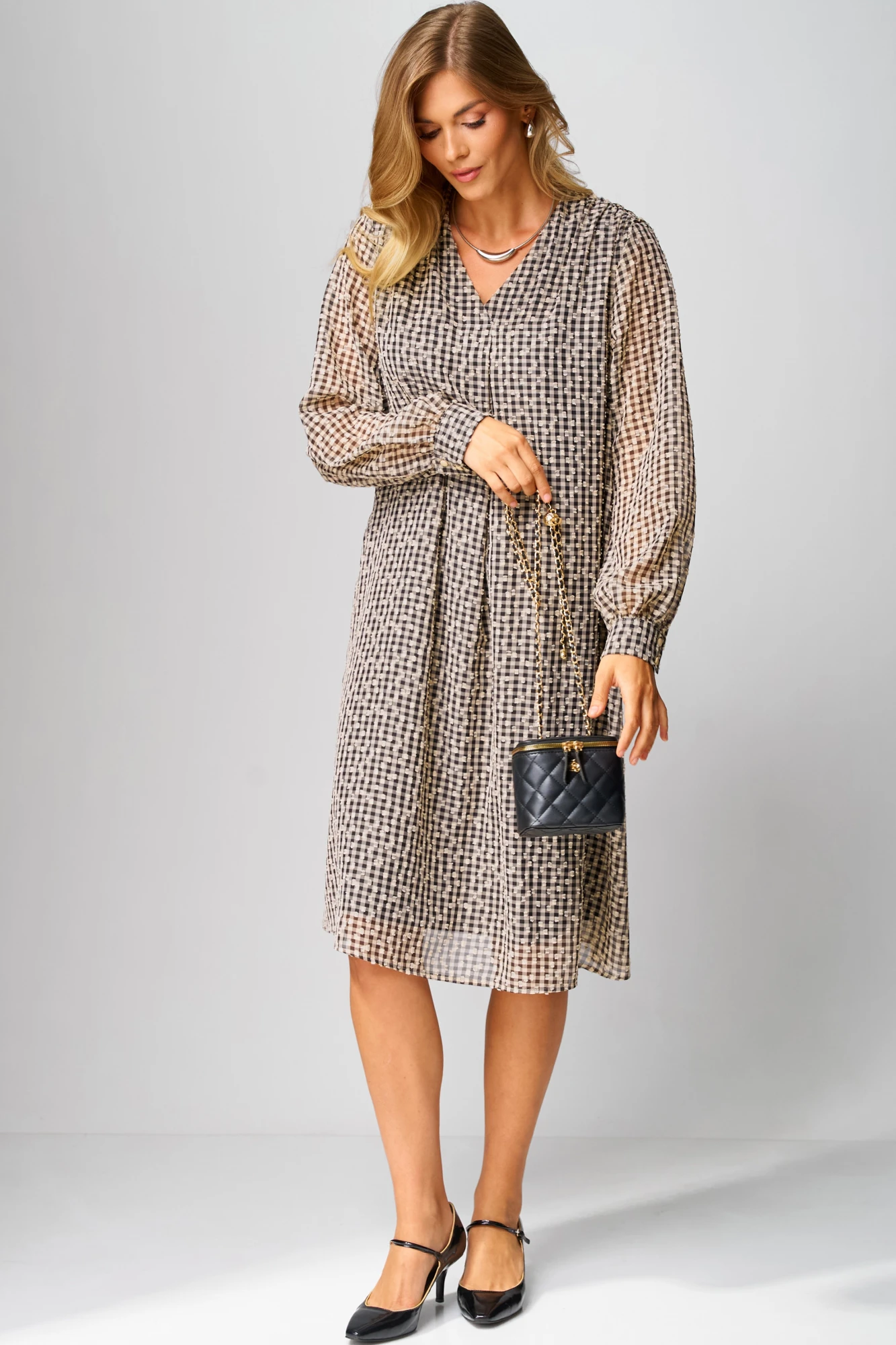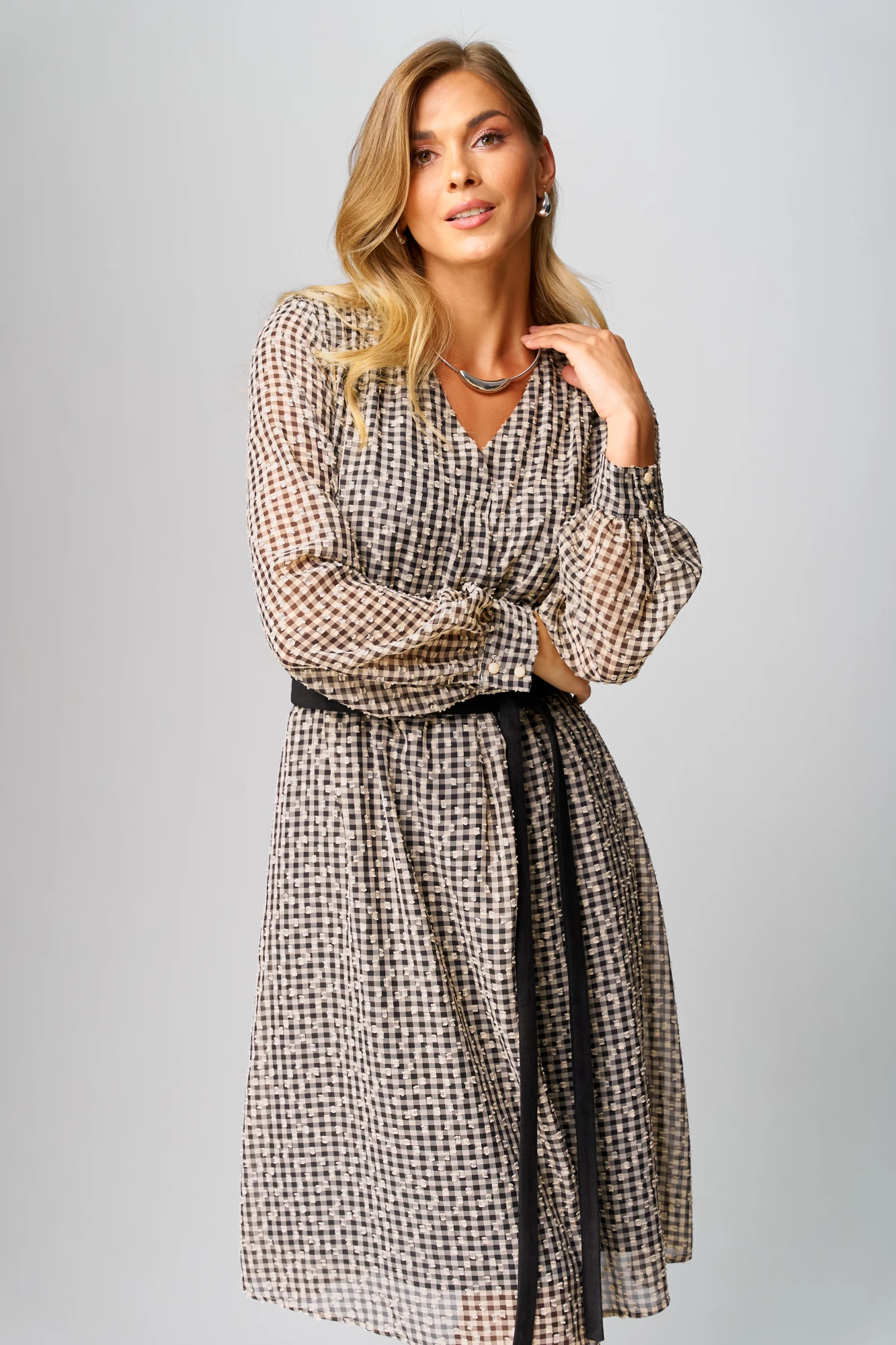 Платье женское, повседневное, на подкладке, свободного силуэта, расширенное книзу, длиной ниже коленей, с втачными рукавами, со съемным поясом. Вырез горловины детали переда платья «V-образной» формы, по центру обработана складка. По плечевым швам обработана сборка. Рукава втачные одношовные, с притачными манжетами, с застежкой на 2 петли и 2 пуговицы. Разрезы обработаны окантовкой, по швам притачивания обработана сборка.