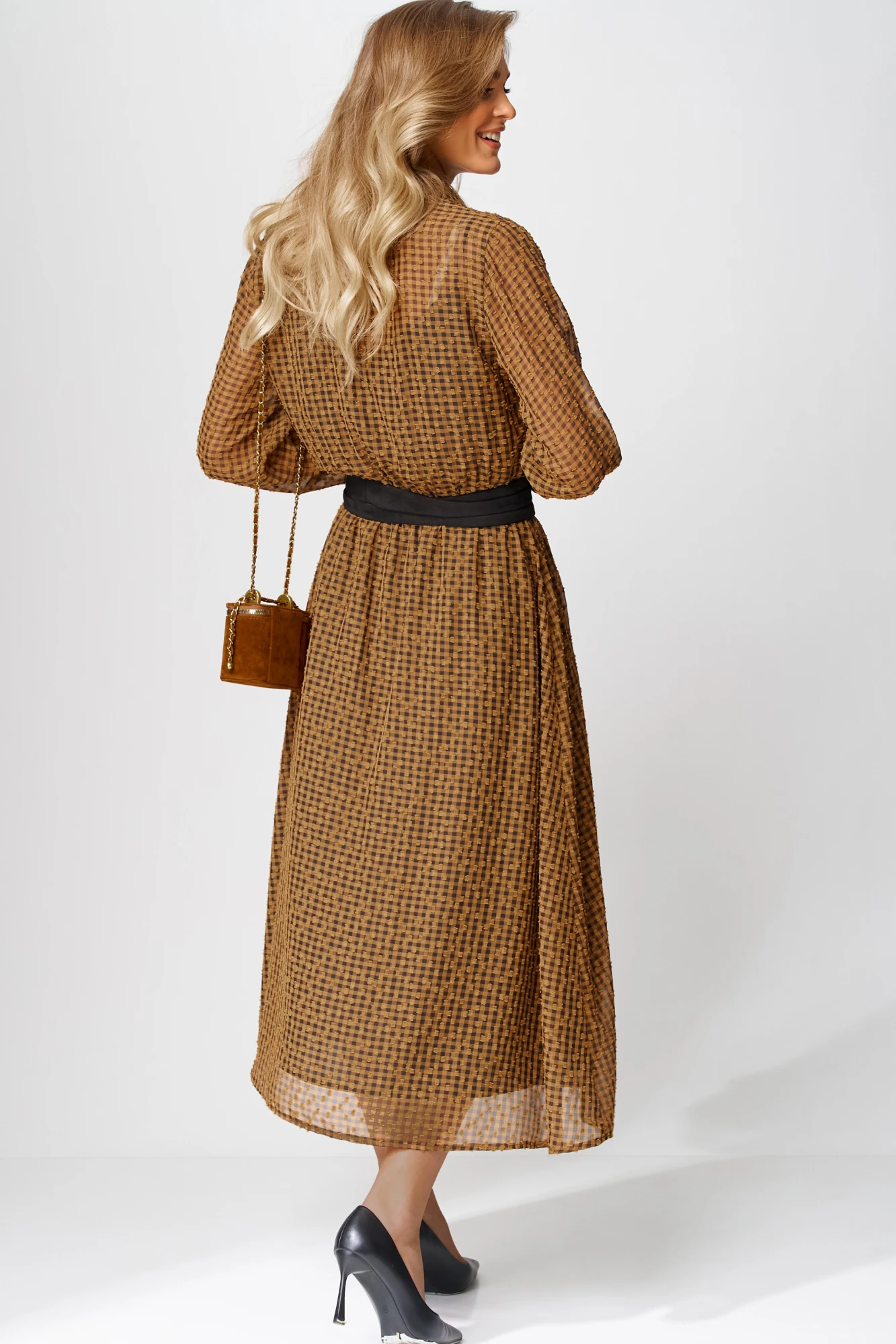 Платье женское, повседневное, полуприлегающего силуэта, длиной в пол, с втачными рукавами, с подрезом на уровне линии талии, со съемным поясом, с втачным воротником. Лиф детали переда платья с застежкой на 5петель и 5 пуговиц и 1 петлю и пуговицу на стойке воротника, по шву соединения с юбкой обработаны по 1-ой складке. Юбка платья на трикотажной подкладке. В шов соединения лифа и юбки вставлена эластичная тесьма. Рукава втачные одношовные, с притачными манжетами, с застежкой на 2 навесные петли и 2 пуговицы. Воротник с отрезной стойкой, вырез горловины округлой формы. Платье: длина рукава- 60см, ширина рукава – 20см, длина спинки – 124см.