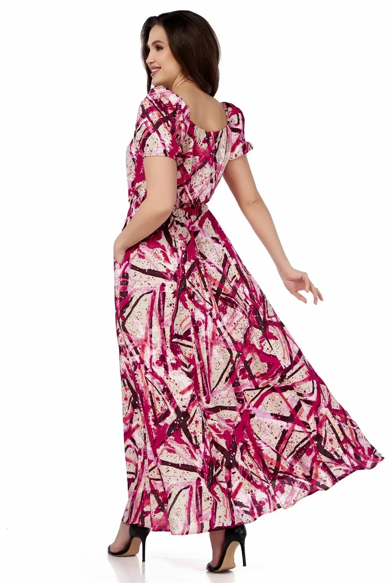 Длинное платье, выполнено из натуральной ткани. По линии талии – подрез с широкой резинкой внутри. Нижняя деталь платья – из клиньев, с большим расширением к низу, по бокам – внутренние карманы. Вырез платья красиво подчеркивает линию плеч, по краю вставлена резинка, при желании можно плечи прикрыть. Рукав до локтя, реглан, снизу – резинка.